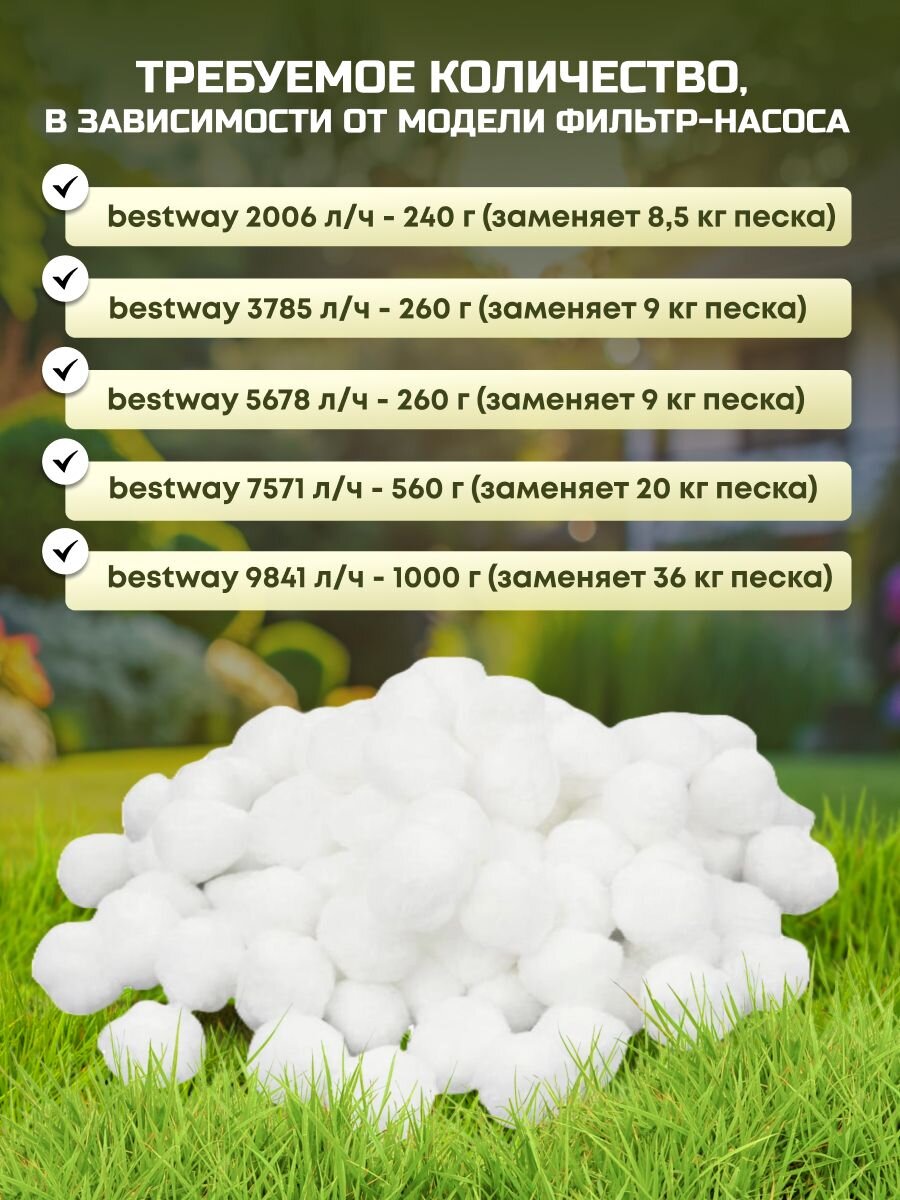 Этот наполнитель изготовлен из полиэтилена и поставляется в удобной упаковке весом 500 грамм, что делает его легким и простым в использовании. В комплекте предусмотрен сетчатый мешок для чистки, который еще больше упрощает процесс обслуживания. Продукт произведен под брендом Bestway, который известен своим качеством и надежностью.