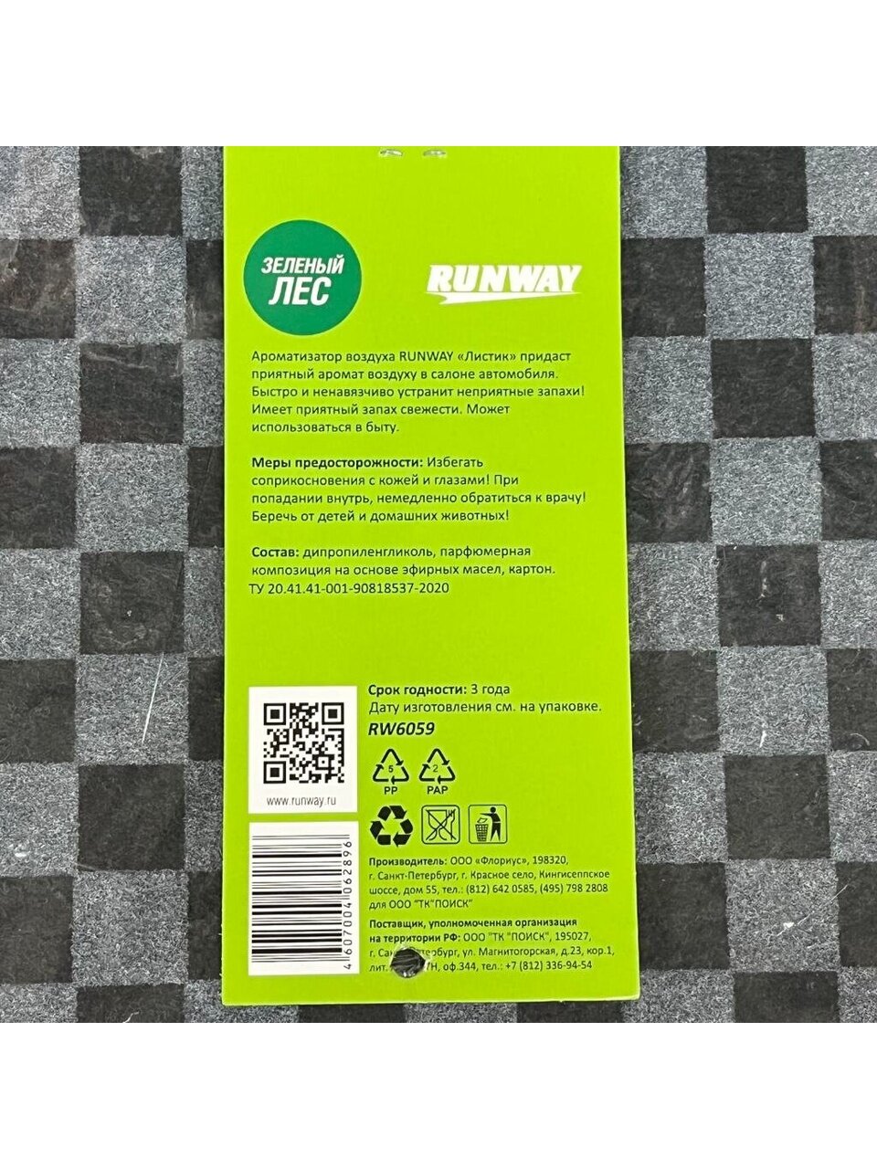 Ароматизатор воздуха RUNWAY «Листик» придаст приятный аромата воздуху в салоне автомобиля. Быстро и ненавязчиво устранит неприятные запахи! Имеет приятный запах свежести. Может использоваться в быту.