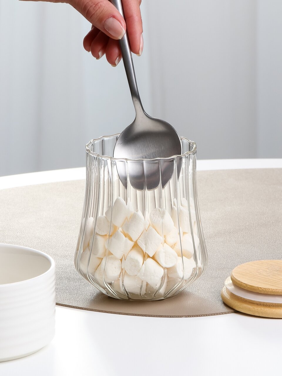 Объём банки — 0,4 литра. Этого достаточно для хранения стандартной упаковки специй, сахара, чая или небольшого количества крупы.