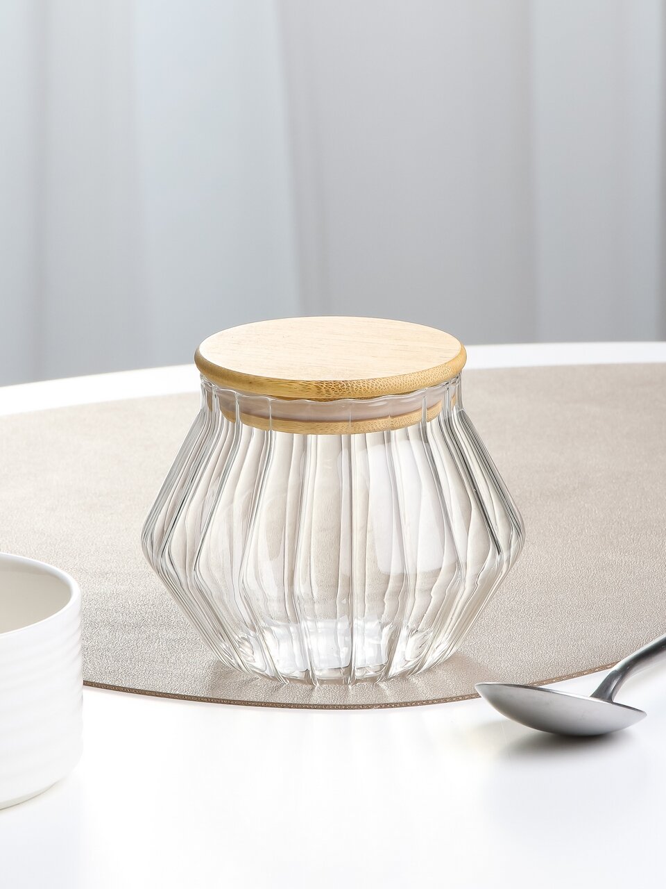 Объём — 0.5 литра, материал — прозрачное стекло с плотно закрывающейся крышкой. Банка устойчива к перепадам температур и не впитывает запахи.