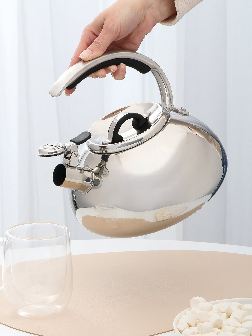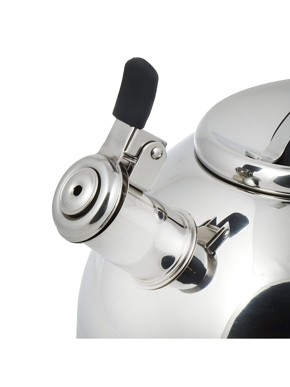Объем чайника — 3 литра. Ручка изготовлена из нержавеющей стали, не имеет термоизоляции, поэтому рекомендуется использовать прихватку при снятии с плиты.