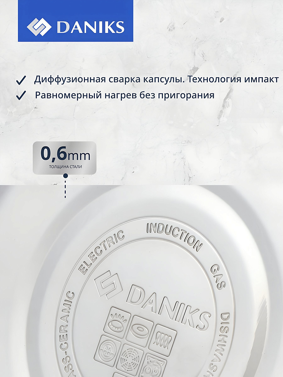 - Совместим с индукционными, газовыми, электрическими и стеклокерамическими плитами — универсальность для любой кухни