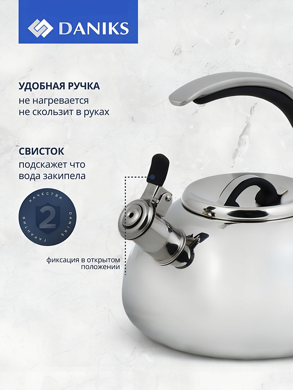 Чем отличается этот чайник от аналогов? В отличие от моделей с эмалированным покрытием, нержавеющая сталь выдерживает интенсивное использование и не боится перепадов температур. Однослойное дно быстро нагревается, что экономит время и энергию. Чайник подходит для индукционных плит, а также для газовых, электрических и стеклокерамических поверхностей — идеальный вариант для тех, кто часто меняет место жительства или ищет подарок. Как использовать чайник Daniks Expert? Просто налейте воду, поставьте на плиту и дождитесь сигнала свистка. Можно мыть в посудомоечной машине, что экономит время на уходе.