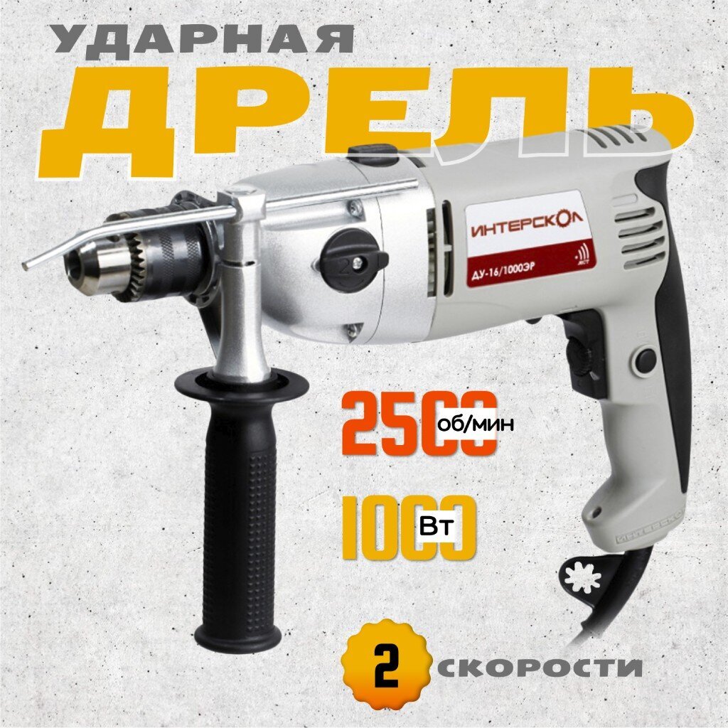 Дрель сетевая ударная Интерскол ДУ-16/1000ЭР имеет два режима работы: вращательный и ударно-вращательный. Двухскоростной редуктор машины имеет прочный корпус из легкого сплава, а двигатель отличается повышенной мощностью. Электронный выключатель позволяет плавно регулировать число оборотов шпинделя и переключать вращение в обратную сторону.