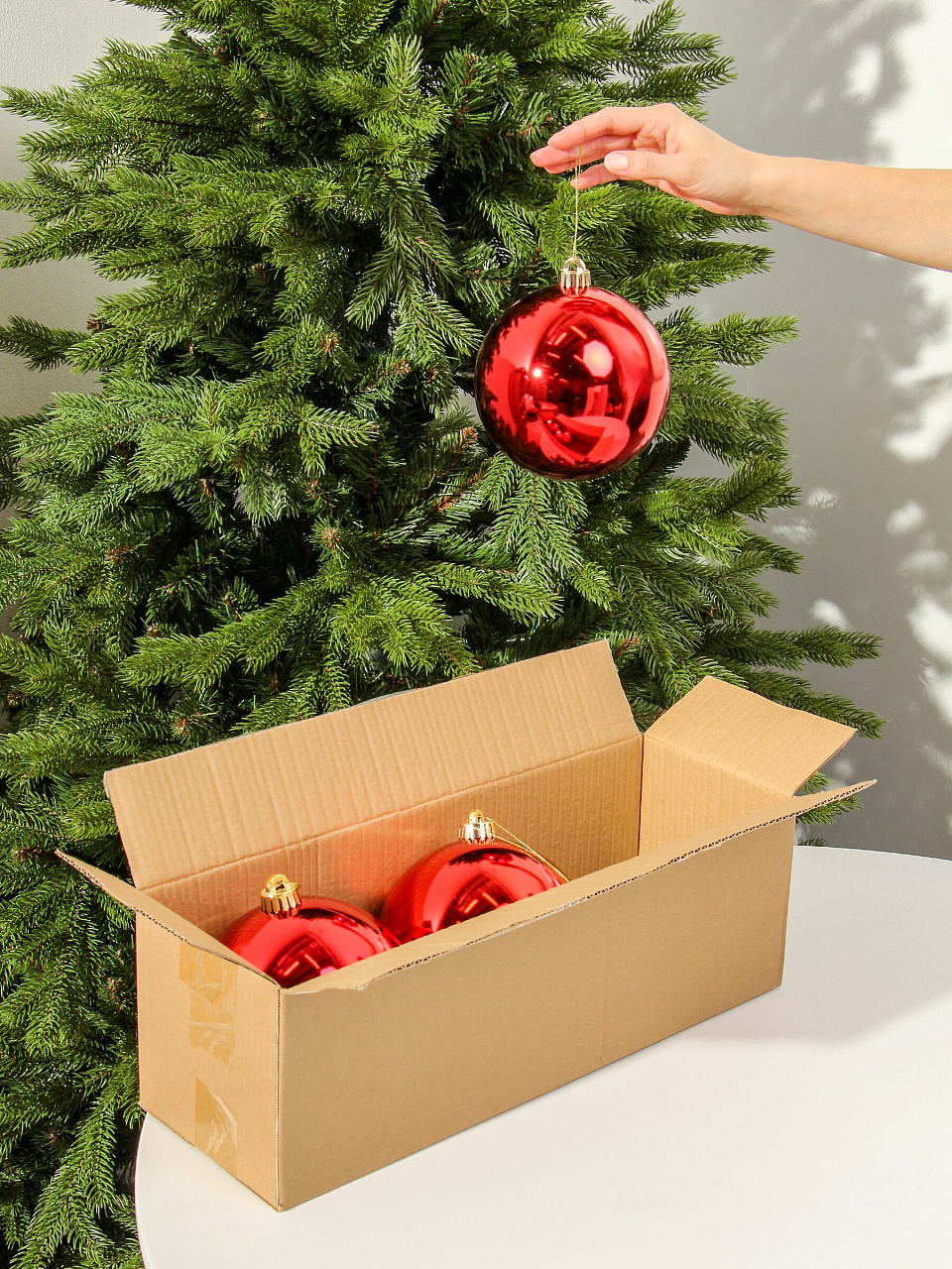 Диаметр каждого шара — 15 см, крепление — на прочной подвеске, что удобно для быстрой фиксации на любой ветке елки.