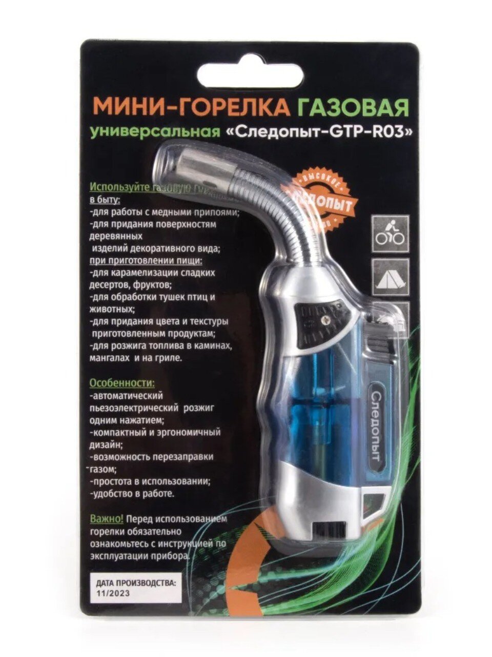 Газовая мини-горелка Следопыт PF-GTP-R03: компактное решение для туризма и быта — безопасный пьезоподжиг, универсальное применение, размер 75х20х125 мм.