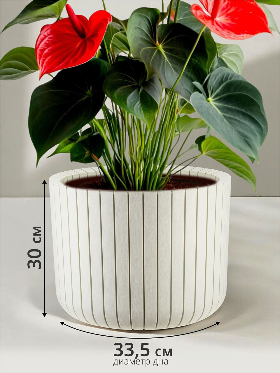 Кашпо выглядит аккуратным компактным, не смотря на свою вместительность. Эффект объемных дощечек создается за счет декоративного ободка, при этом объем кашпо не уменьшается. Ободок также выполняет функцию ребра жесткости, что сохраняет прочность конструкции.