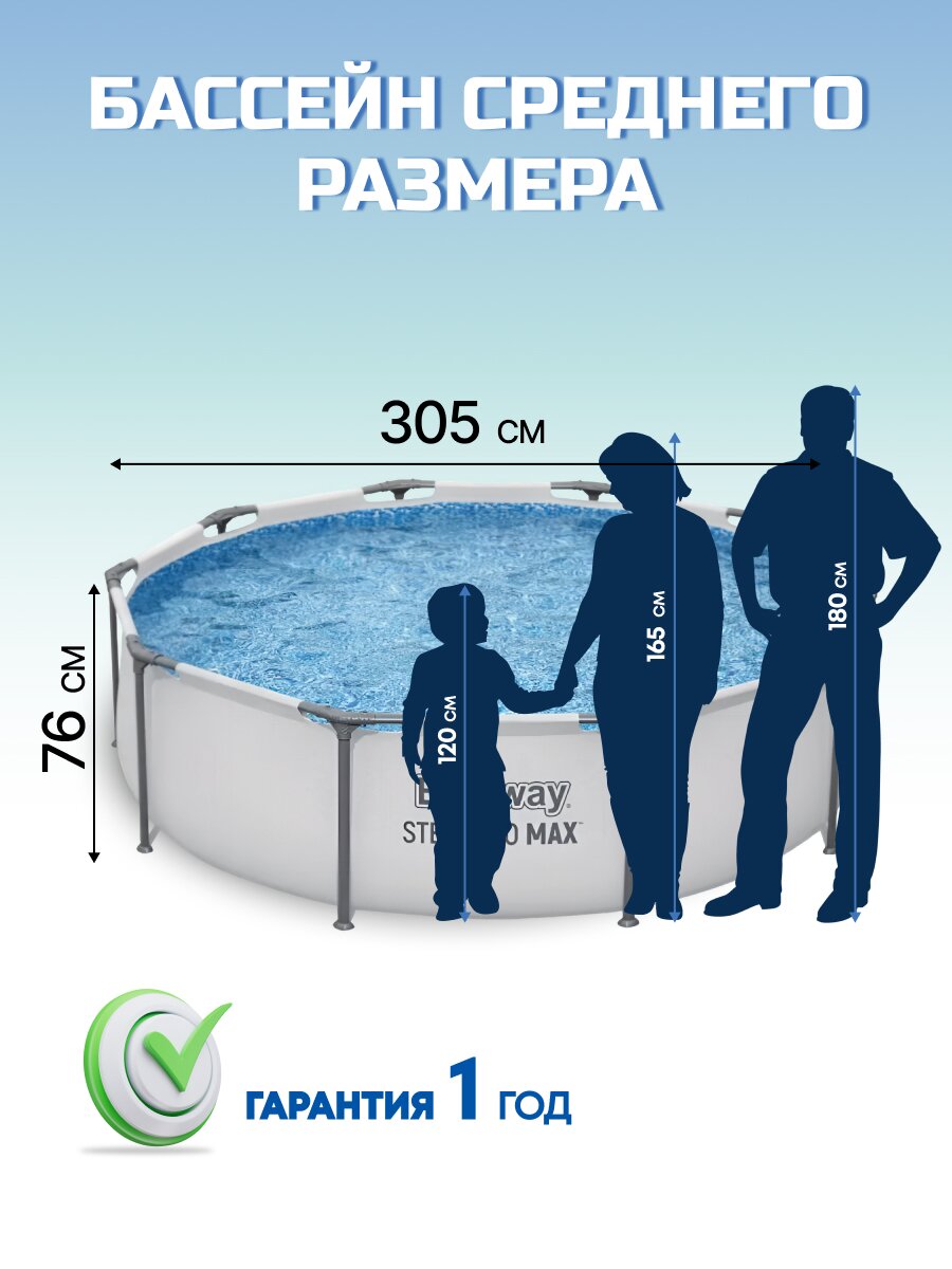 Каркасный бассейн Bestway 305х76 см — оптимальное решение для отдыха на даче: прочная стальная конструкция, объём 4678 л, свежесть и комфорт даже в жару.