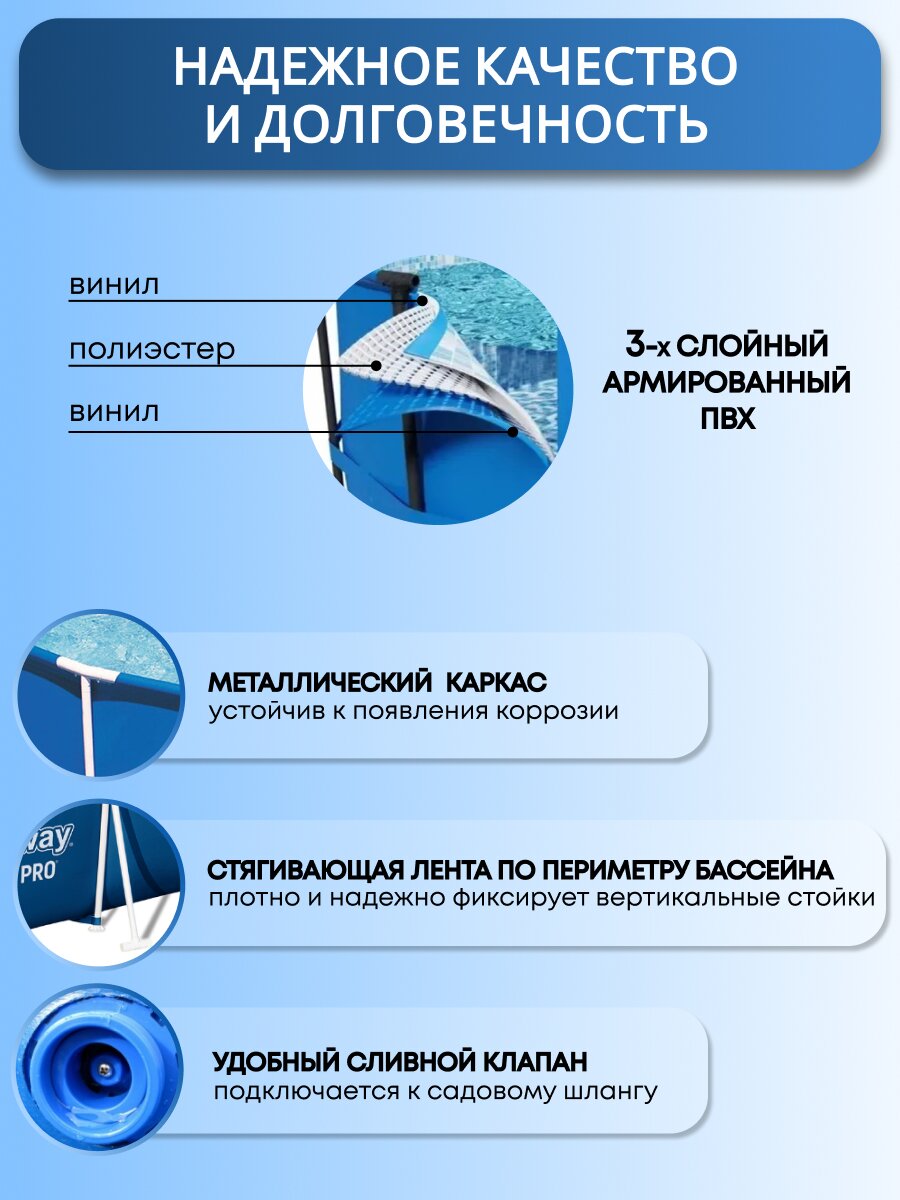 Бассейн Bestway Steel Pro отличается прочностью и стабильностью. Его каркас выполнен из стали, что гарантирует долговечность и устойчивость конструкции. Чаша бассейна изготовлена из трехслойного ПВХ, который не только прочен, но и безопасен для использования. Внутренняя поверхность бассейна имеет расцветку под мозаику, что добавляет эстетическую привлекательность и создает атмосферу настоящего курорта.