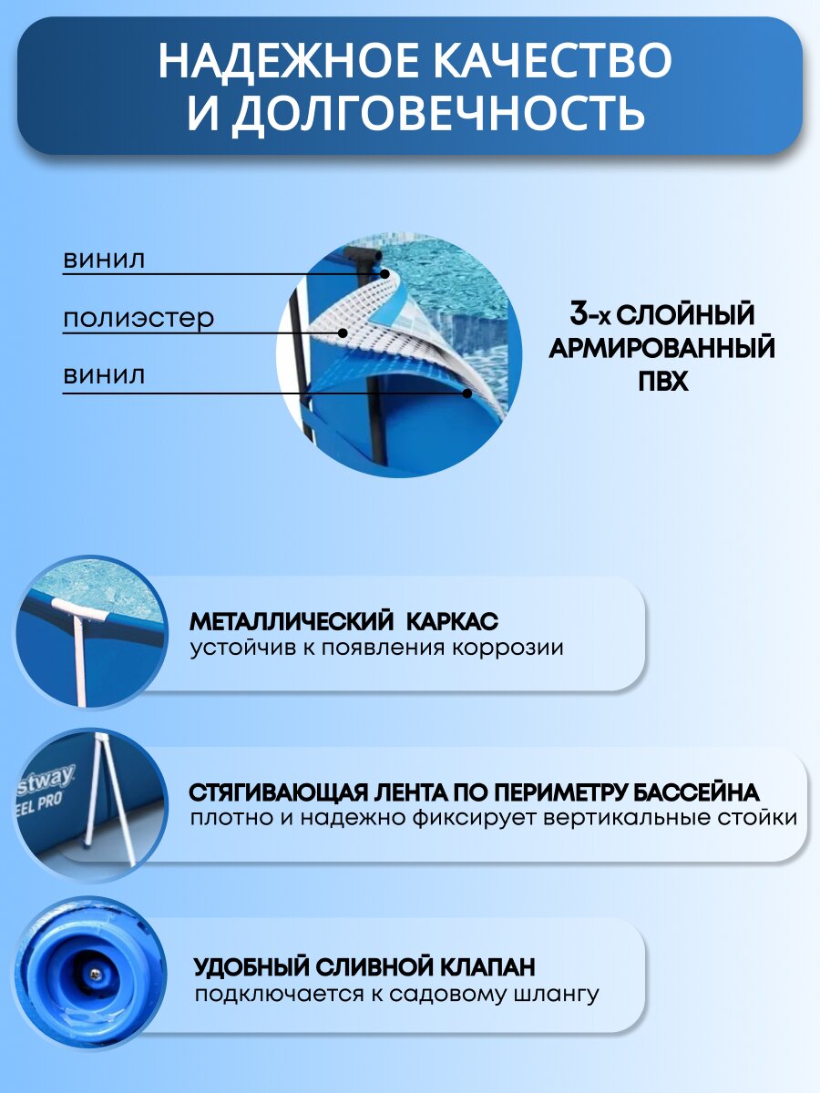 Покупка каркасного бассейна Bestway - это инвестиция в комфорт и здоровье. Он станет центром притяжения для всей семьи и друзей, обеспечивая массу положительных эмоций и укрепляя здоровье благодаря водным процедурам. Превратите свой участок в зону отдыха и наслаждайтесь каждым моментом лета с бассейном Bestway Steel Pro!