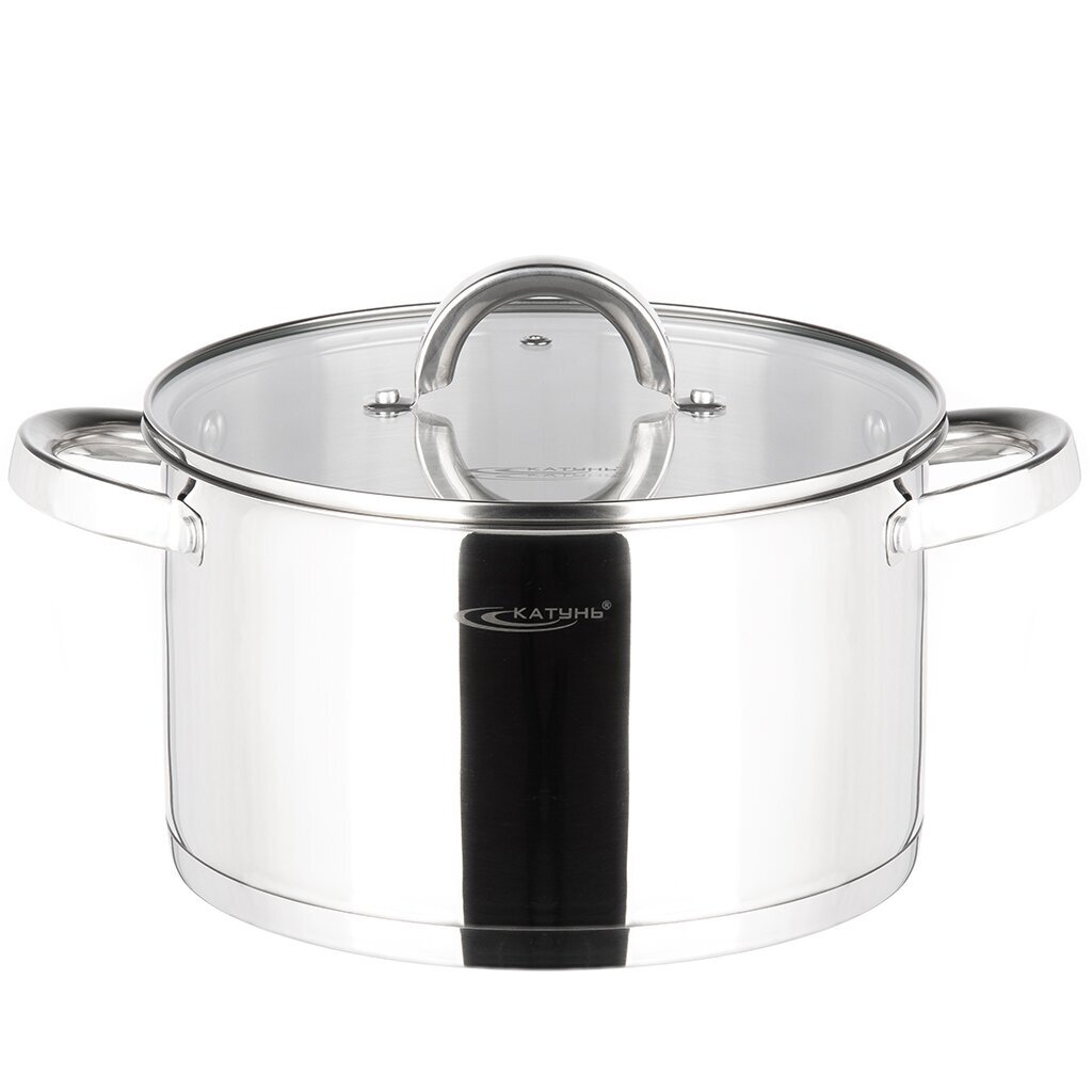 Кастрюля из нержавеющей стали 4.5 л Катунь Этна — универсальное решение для кухни: подходит для индукции, газовых и электрических плит, с мерной шкалой и стеклянной крышкой.