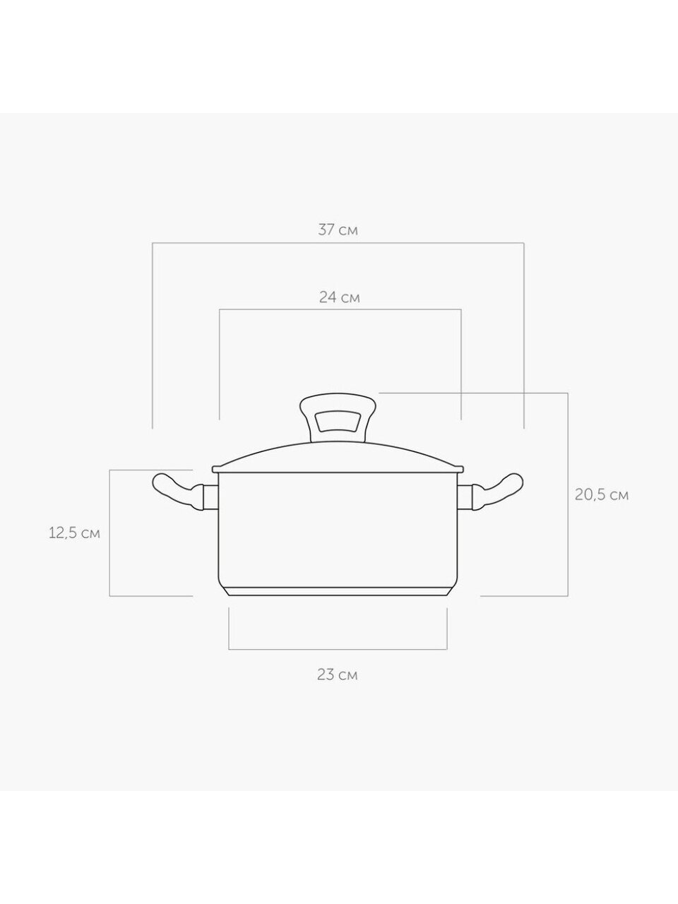 Объём кастрюли — 5.4 литра, диаметр 24 см, высота с крышкой 20.5 см, вес 2.18 кг. В комплекте стеклянная крышка с выпускным клапаном и бакелитовой ручкой.