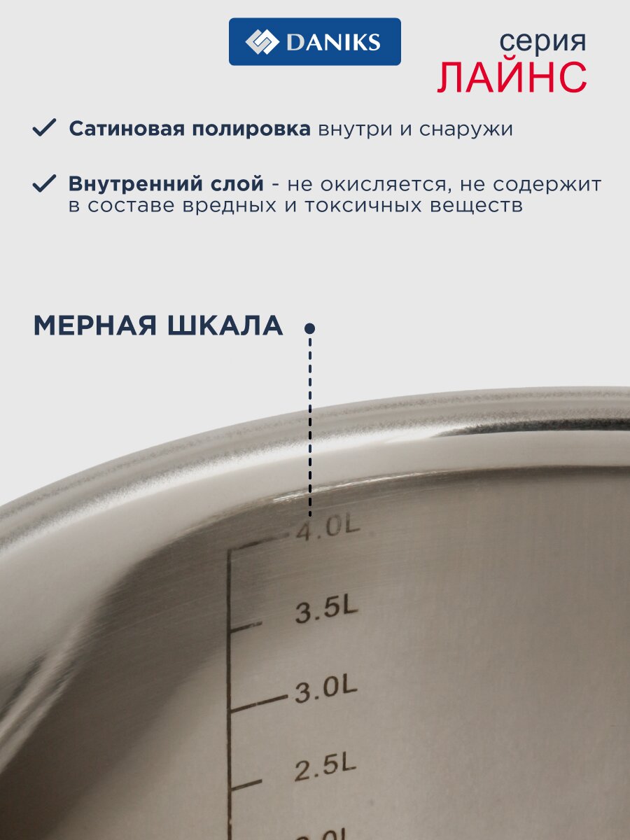 Кастрюля Daniks Лайнс 4.75 л из нержавеющей стали — универсальное решение для кухни: варите супы, борщи и компоты на любой плите без риска пригорания.