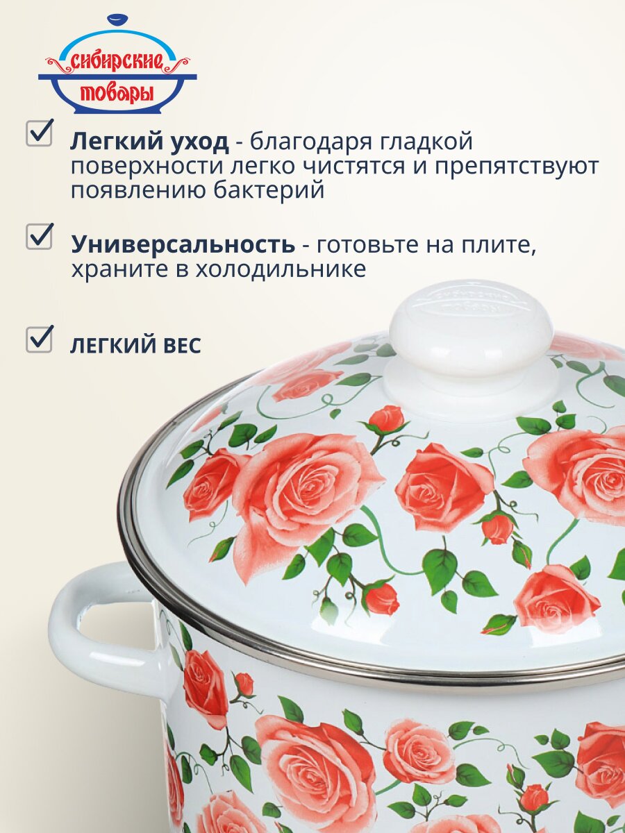 Кастрюля эмалированная сталь 4 л с крышкой для индукции — стиль «Роза плетистая» от бренда «Сибирские товары»: идеальное решение для кухни и дачи, долговечность и универсальность.