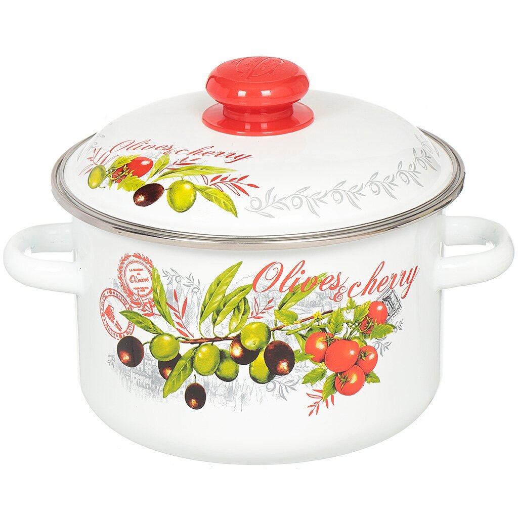 Кастрюля эмалированная 3 л «Оливки и черри» — универсальное решение для кухни и дачи: долговечная сталь, подходит для индукции, легко мыть, яркий дизайн.