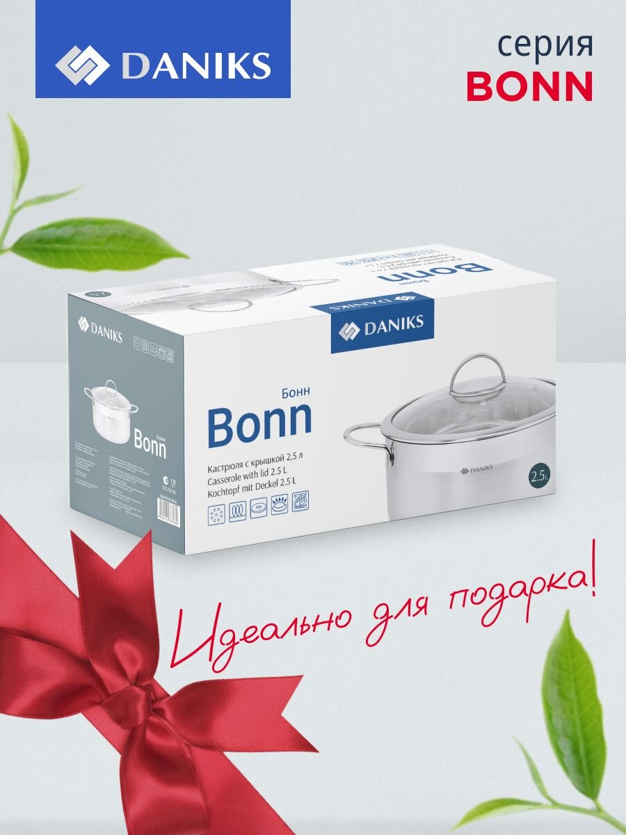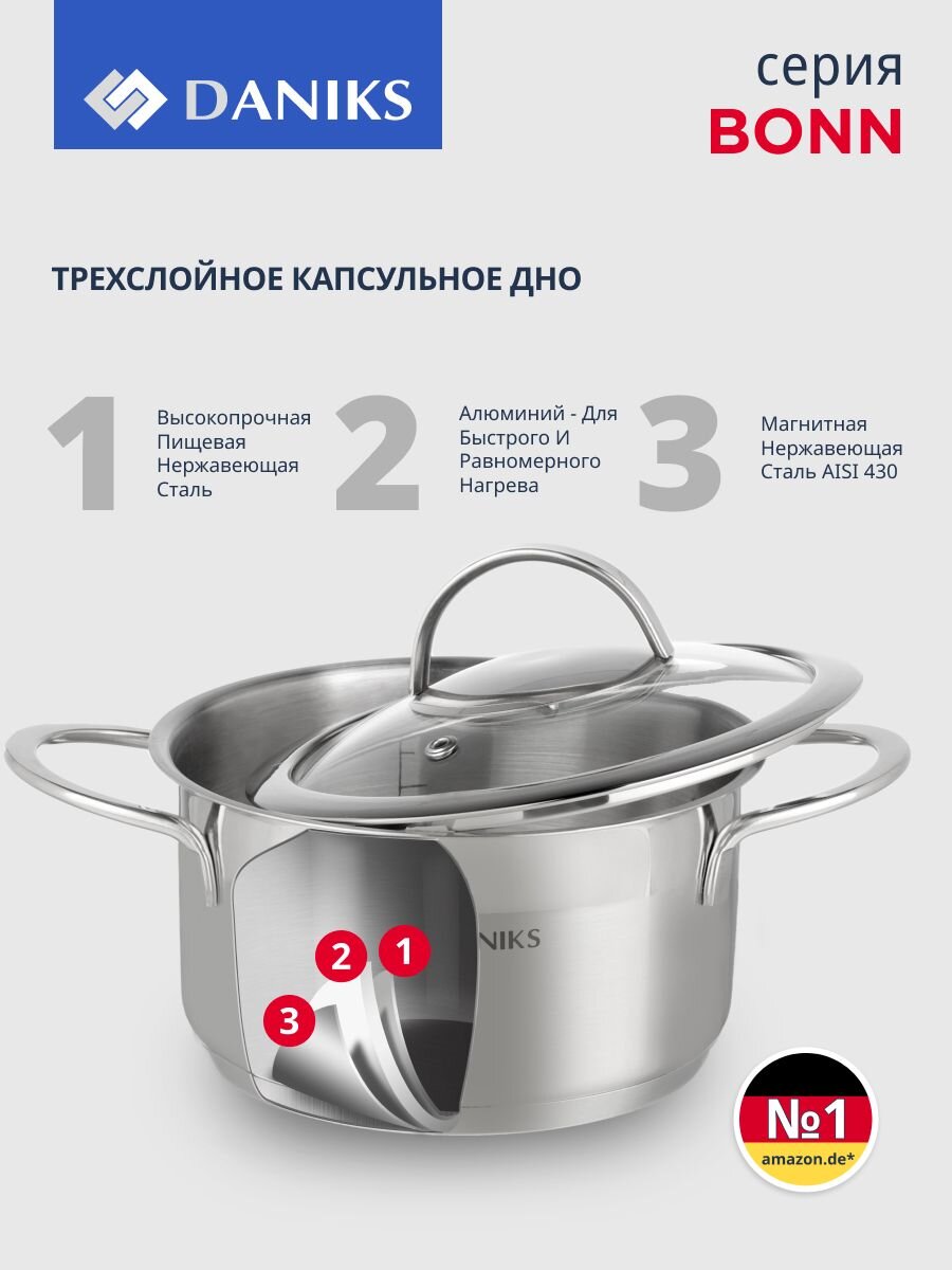 Кастрюля Daniks Бонн 1.8 л — универсальное решение из нержавеющей стали для индукционных плит: долговечность, мерная шкала, стеклянная крышка.