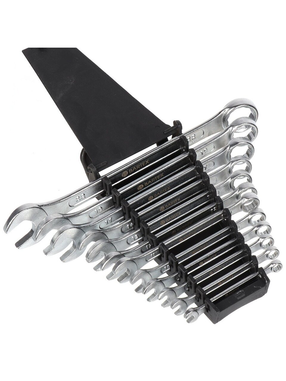 Комбинированный набор Bartex состоит из 12 рожковых и накидных ключей. U-образный рабочий профиль захватывает крепеж с двух или трех сторон. Профиль О захватывает крепежный элемент со всех сторон, что позволяет работать с тугими соединениями.