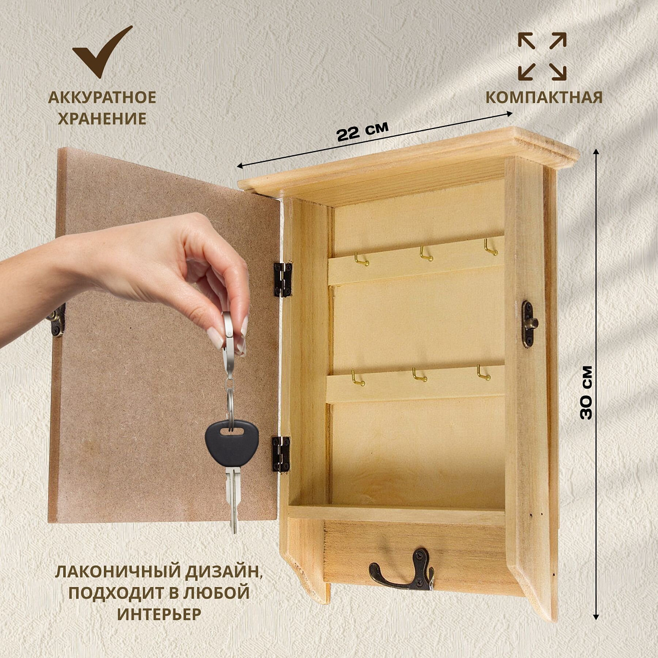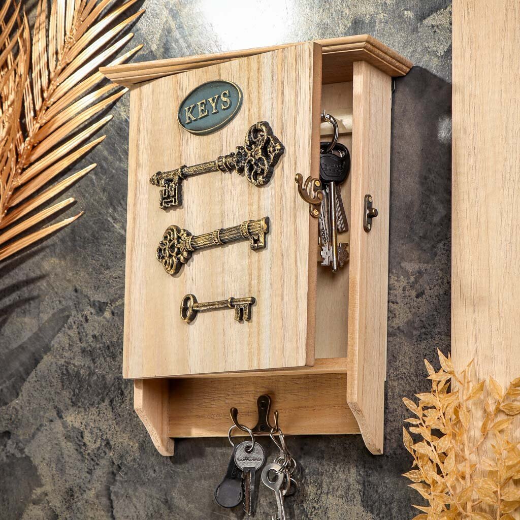Ключница представляет собой небольшой навесной шкафчик для хранения ключей. Не занимает много места в прихожей и освободит вас от поиска ключей. Ключница позволяет собрать все ключи в одном месте и при этом скрывает их от посторонних глаз. Задняя стенка внутренней части изделия оборудована удобными крючками. На внешней части задней стенки данной ключницы имеются петли, с помощью которых ключницу возможно без затруднений закрепить на стене.