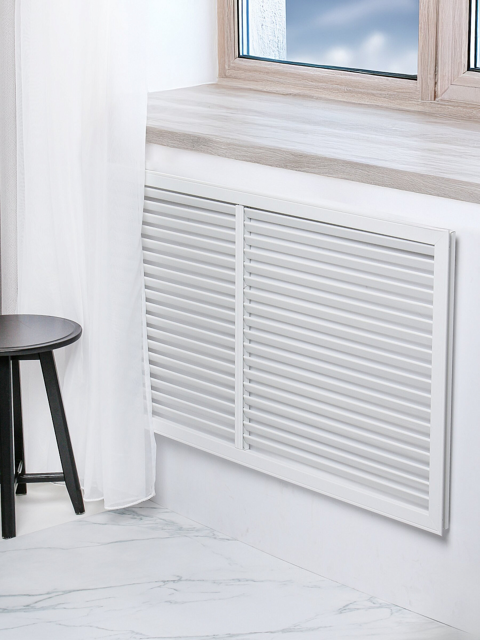 Радиаторная решетка позволяет закрыть ниши с батареями отопления, когда их внешний вид не вписывается в созданный интерьер. При этом теплый воздух будет беспрепятственно поступать в помещение через достаточное количество отверстий в жалюзи.