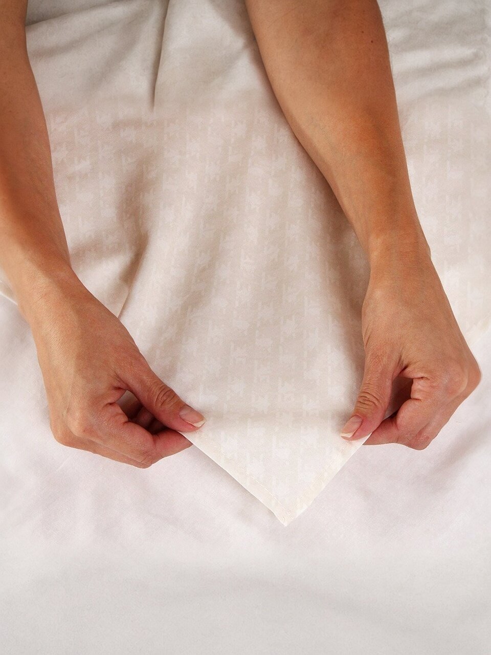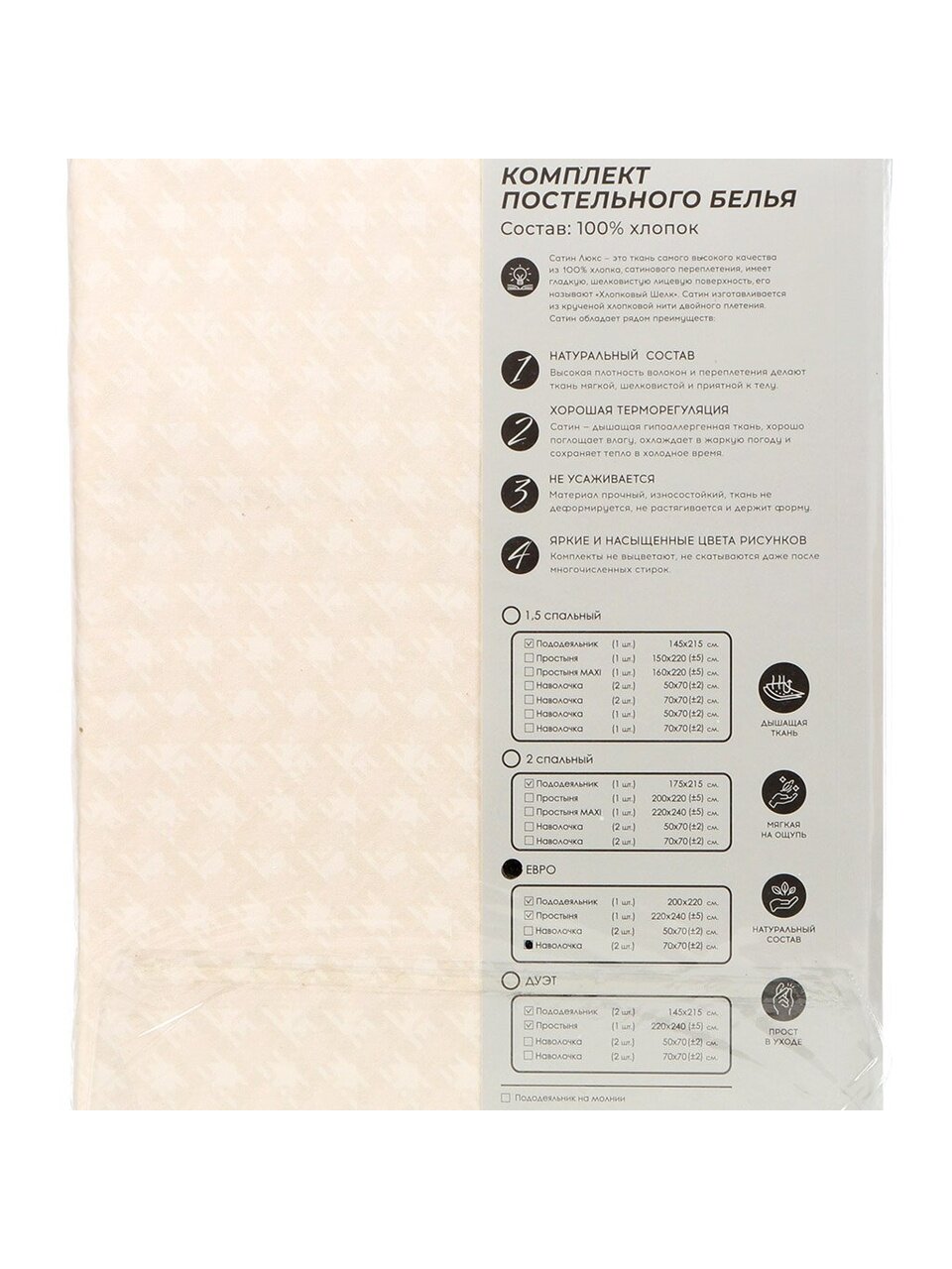 - Универсальный евро-размер: простыня 220х240 см, пододеяльник 200х220 см, 2 наволочки 70х70 — подходит для большинства кроватей