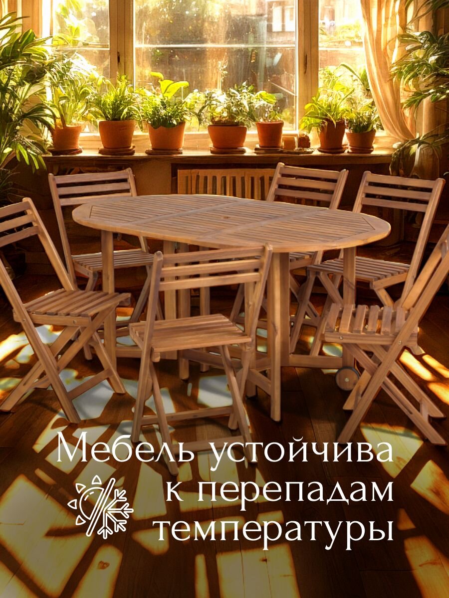 При производстве мебели из акации, используется древесина наивысшего качества, со стабильными эстетическими характеристиками. Но прежде чем купить набор из натурального дерева, следует ознакомиться с особенностью ухода. Необходимо периодически обрабатывать поверхность столов и стульев специальными противогрибковыми пропитками, чтобы максимально продлить срок их эксплуатации. Товар поставляется в полной комплектации. Приобретение элементов по отдельности не представляется возможным.