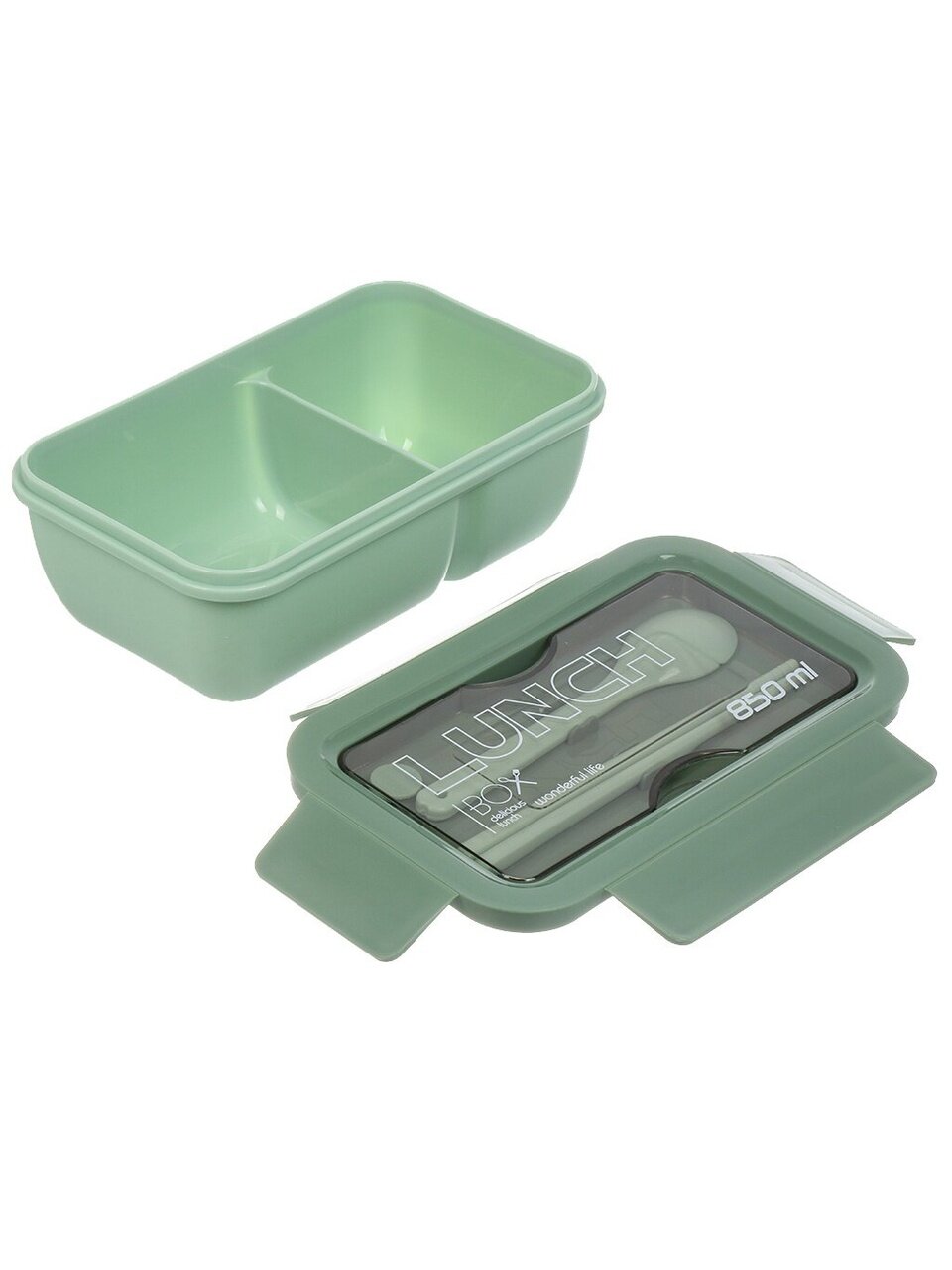 В комплекте есть ложка, герметичная крышка с защелкой, а также отдельные отсеки для разных блюд — это удобно для обеда вне дома.