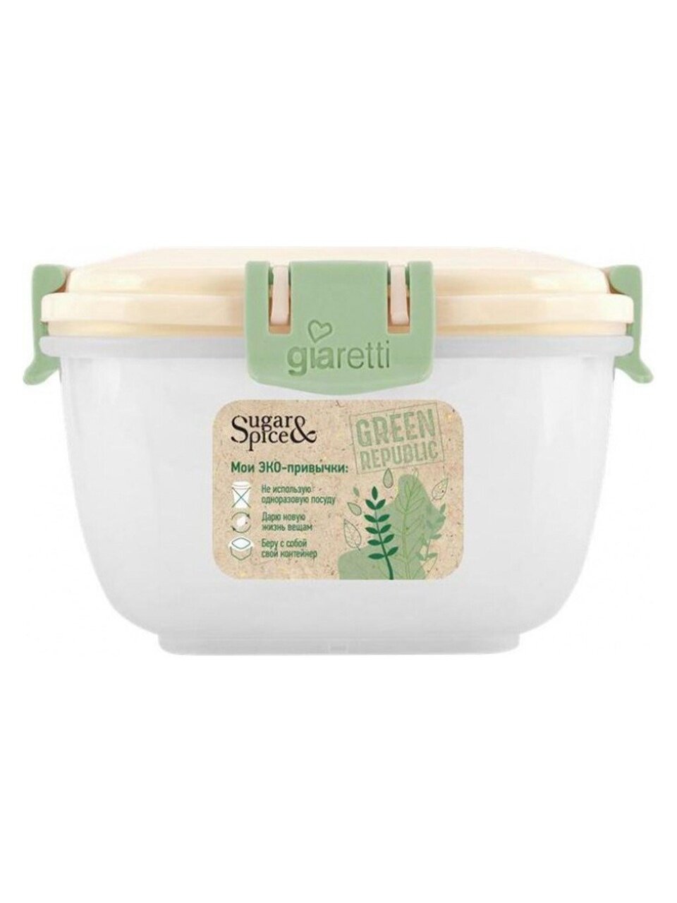 Объём — 1 литр, размеры: 16.5х16.5х9 см, форма — квадратная, цвет — бежевый с зелёным. Подходит для хранения и транспортировки разных продуктов.