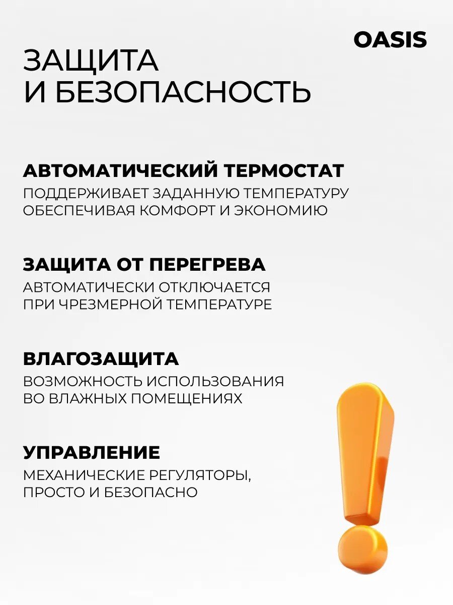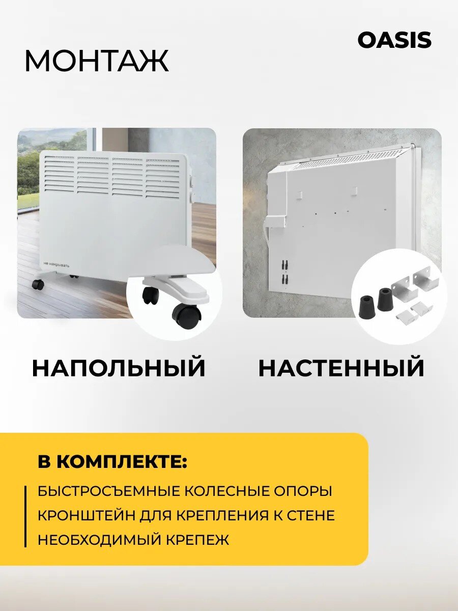 - Экономичность. Благодаря высокой энергоэффективности, конвектор Oasis KM-15 потребляет меньше электроэнергии, чем многие другие модели. Это значит, что вы можете наслаждаться теплом, не беспокоясь о счетах за электричество.