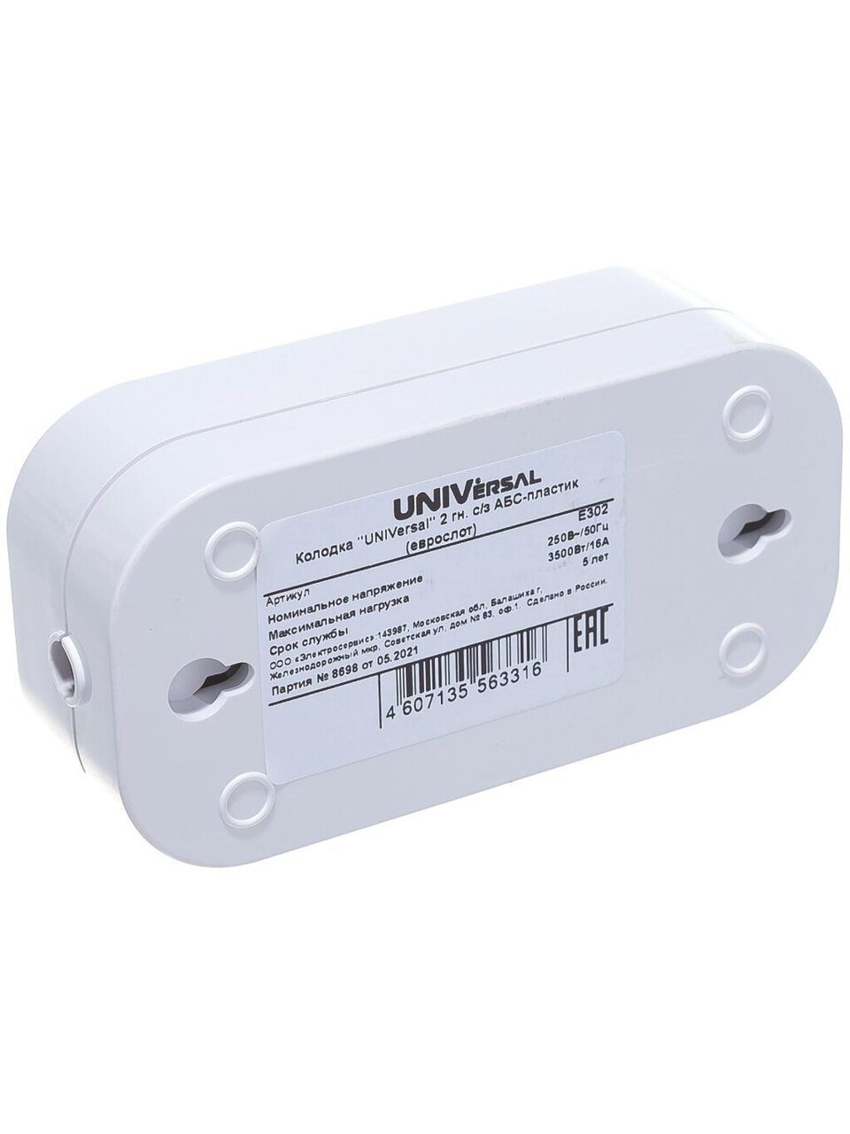 Вы можете приобрести «Колодка розеточная 2 гнезда, 2 полюса, с заземлением, 16 А, 3.5 кВт, белый, UNIVersal, E302» и другие товары в нашем интернет-магазине в Казани по низким ценам и с бесплатным самовывозом.