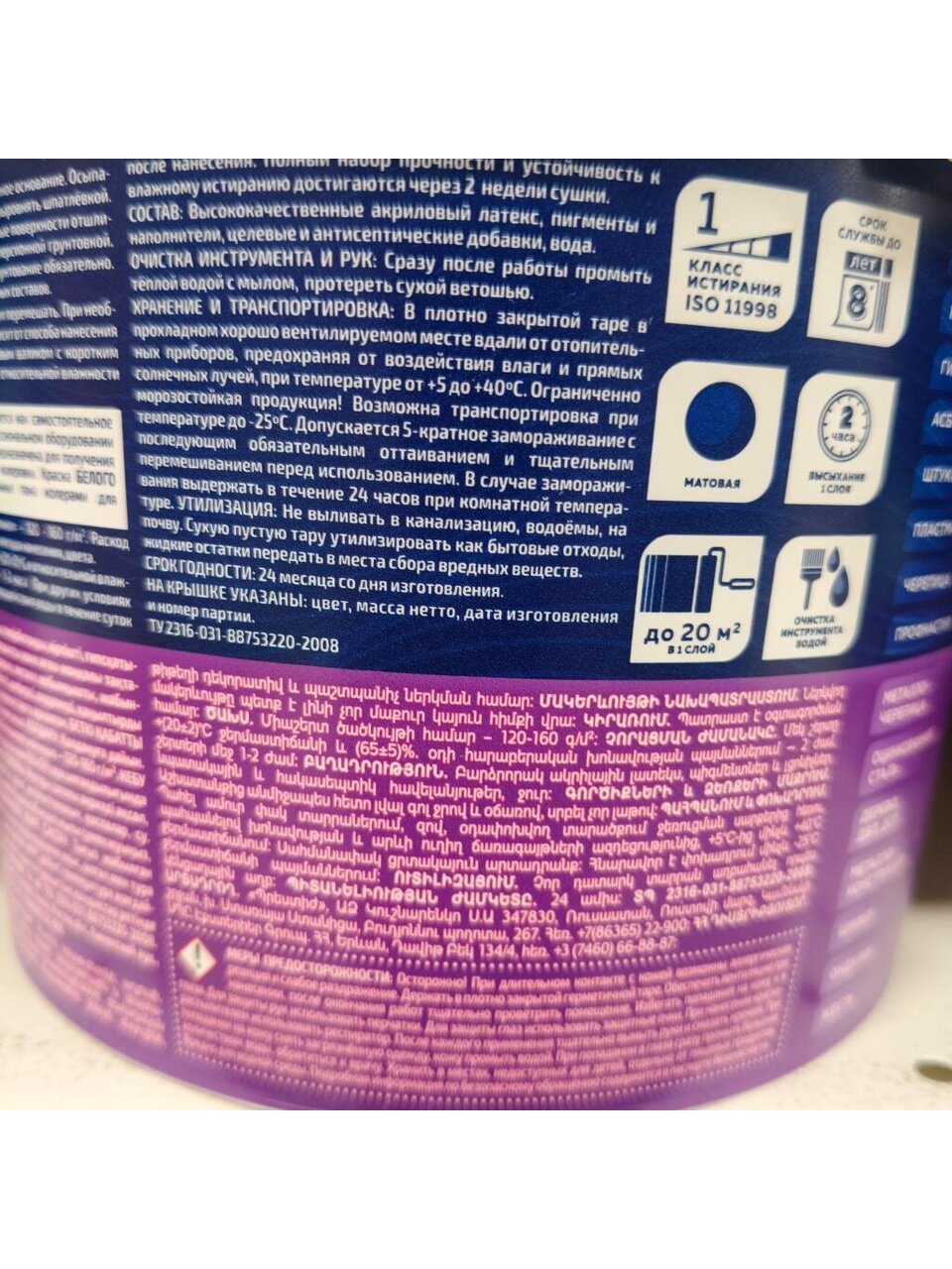 - Состав: Высококачественные акриловый латекс, пигменты и наполнители, целевые и антисептические добавки, вода.