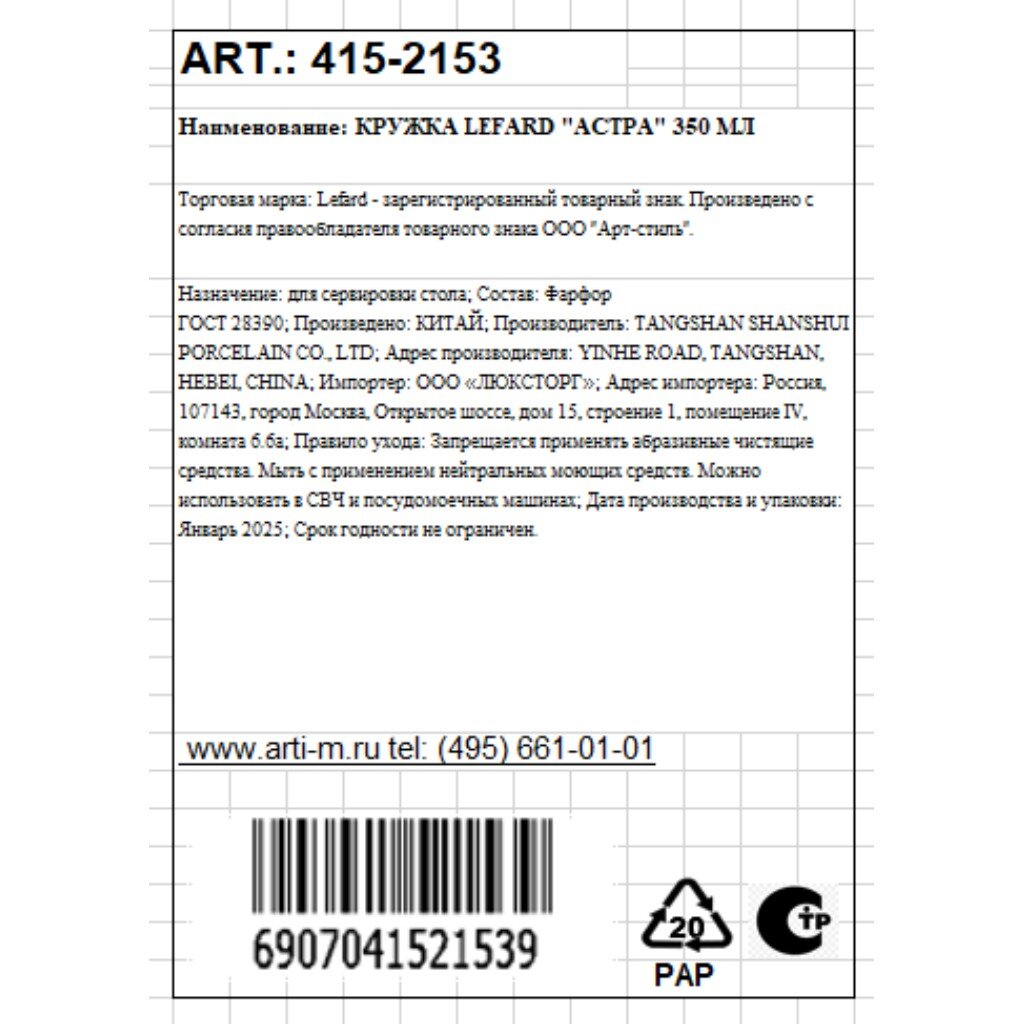 Выберите фарфоровую кружку Lefard «Астра» 350 мл — оригинальная упаковка и гарантия качества от проверенного бренда. Закажите прямо сейчас и порадуйте близких стильным подарком!