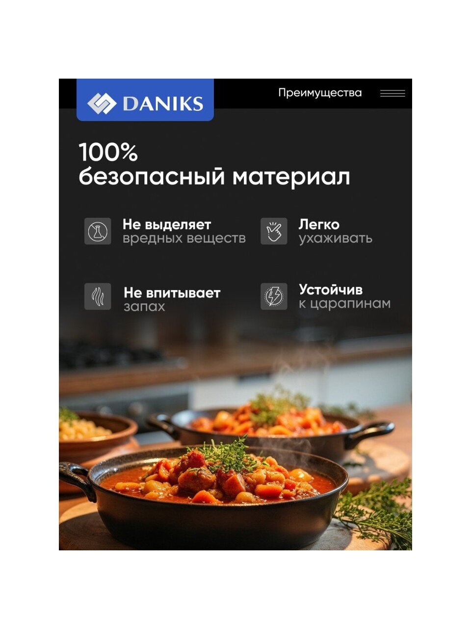 Эргономичные формы делают посуду удобной и практичной в процессе эксплуатации. Качественные материалы и современные технологии способствуют долгому сроку службы изделия. А соответствие всем экологическим нормам характеризует изделия торговой марки «Daniks» безопасными для потребителя.
