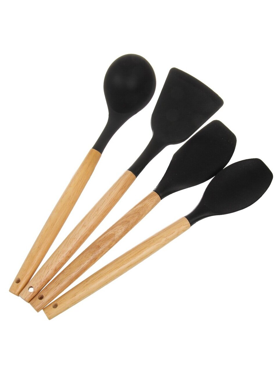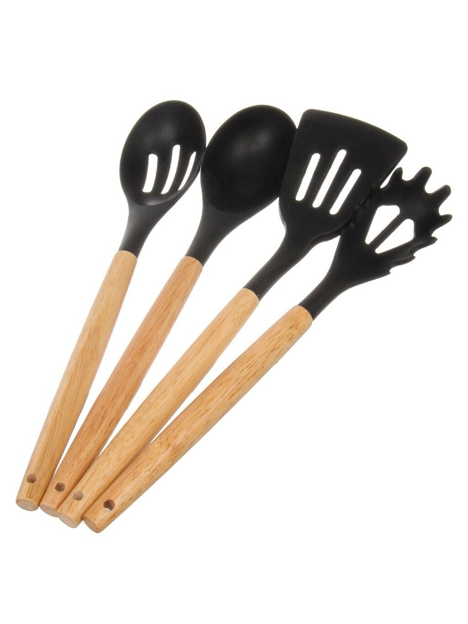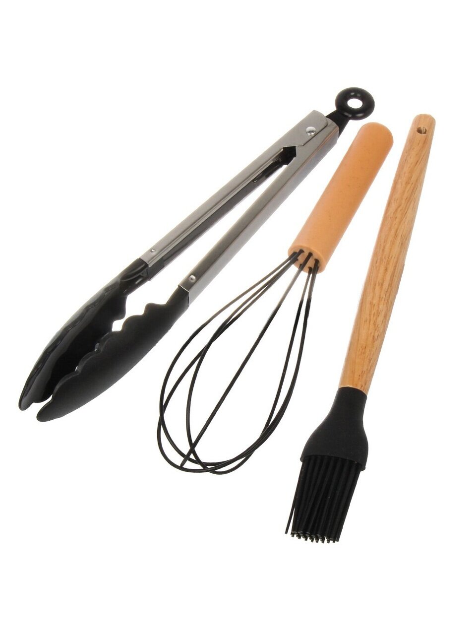 Принадлежности из силикона и бамбука не повреждают антипригарное покрытие посуды, что особенно важно для сохранения ее внешнего вида и функциональности. Эргономичные рукоятки из бамбука и пластика обеспечивают комфортное использование и надежный захват. Черный цвет набора гармонично впишется в любой интерьер, придавая кухне современный и стильный вид. Компактная подставка с доской делает организацию пространства максимально эффективной.