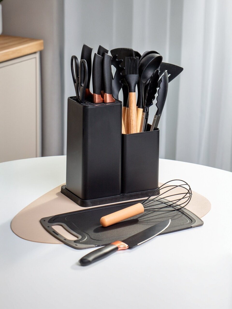 Набор кухонных принадлежностей 19 пр, силикон-бамбук, подставка с доской, черный, Daniks, Y-9559 — идеальное решение для современной кухни, сочетающее стильный дизайн и функциональность. Универсальный комплект станет незаменимым помощником как для опытных кулинаров, так и для тех, кто только начинает осваивать искусство приготовления блюд. Благодаря продуманной комплектации, можно с легкостью выполнять различные кулинарные задачи: нарезать мясо, готовить кондитерские изделия, взбивать ингредиенты, снимать пену, готовить спагетти и многое другое. Ножи в комплекте выполнены из нержавеющей стали, что гарантирует долгий срок службы и легкость ухода. Разделочная доска и удобная подставка с доской обеспечивают порядок на рабочей поверхности и экономят место на кухне.