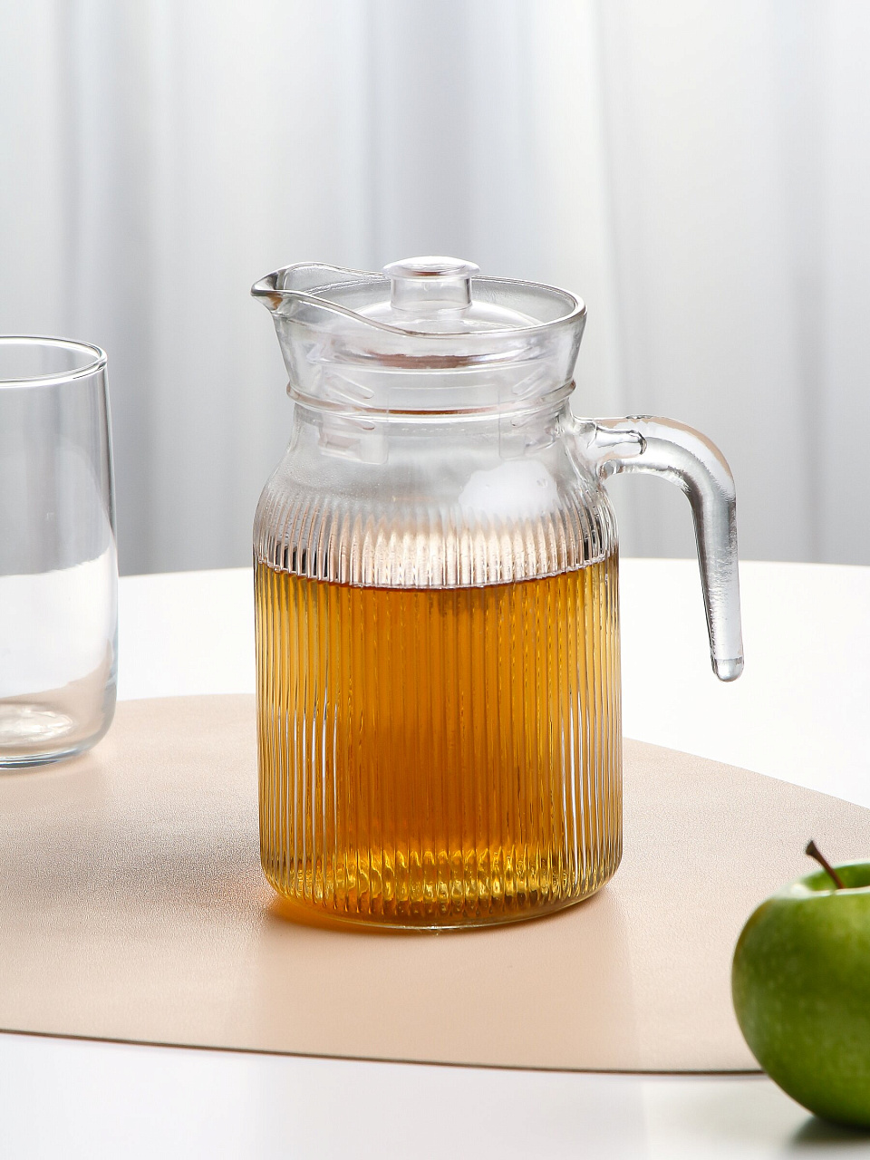 Объем кувшина — 1,2 литра. Это оптимально для 3-5 человек: можно подать воду, компот или лимонад на стол, не переживая, что напитка не хватит.