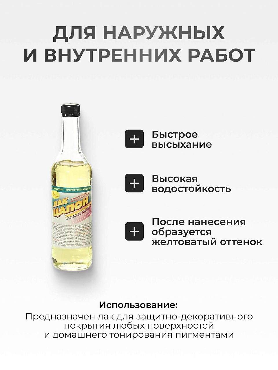Лак быстро высыхает, образуя твердую лаковую пленку, обладающую высокой степенью водостойкости. После нанесения образуется желтоватый оттенок.