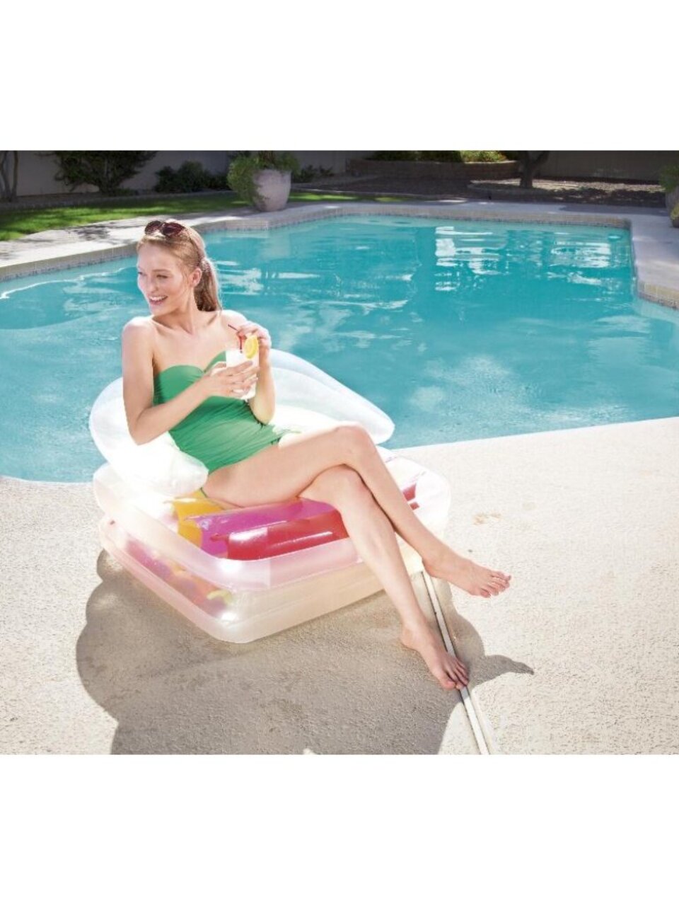 Современный и яркий матрас-трансформер специально предназначен для максимально комфортного отдыха на воде. Матрас сделан из прозрачного материала с цветными вставками и оборудован спинкой, подлокотниками и подголовником. Матрас удобен тем, что одним движением руки складывается вдвое и превращается в удобное кресло, которое прекрасно держится на воде и подходит для отдыха на берегу.