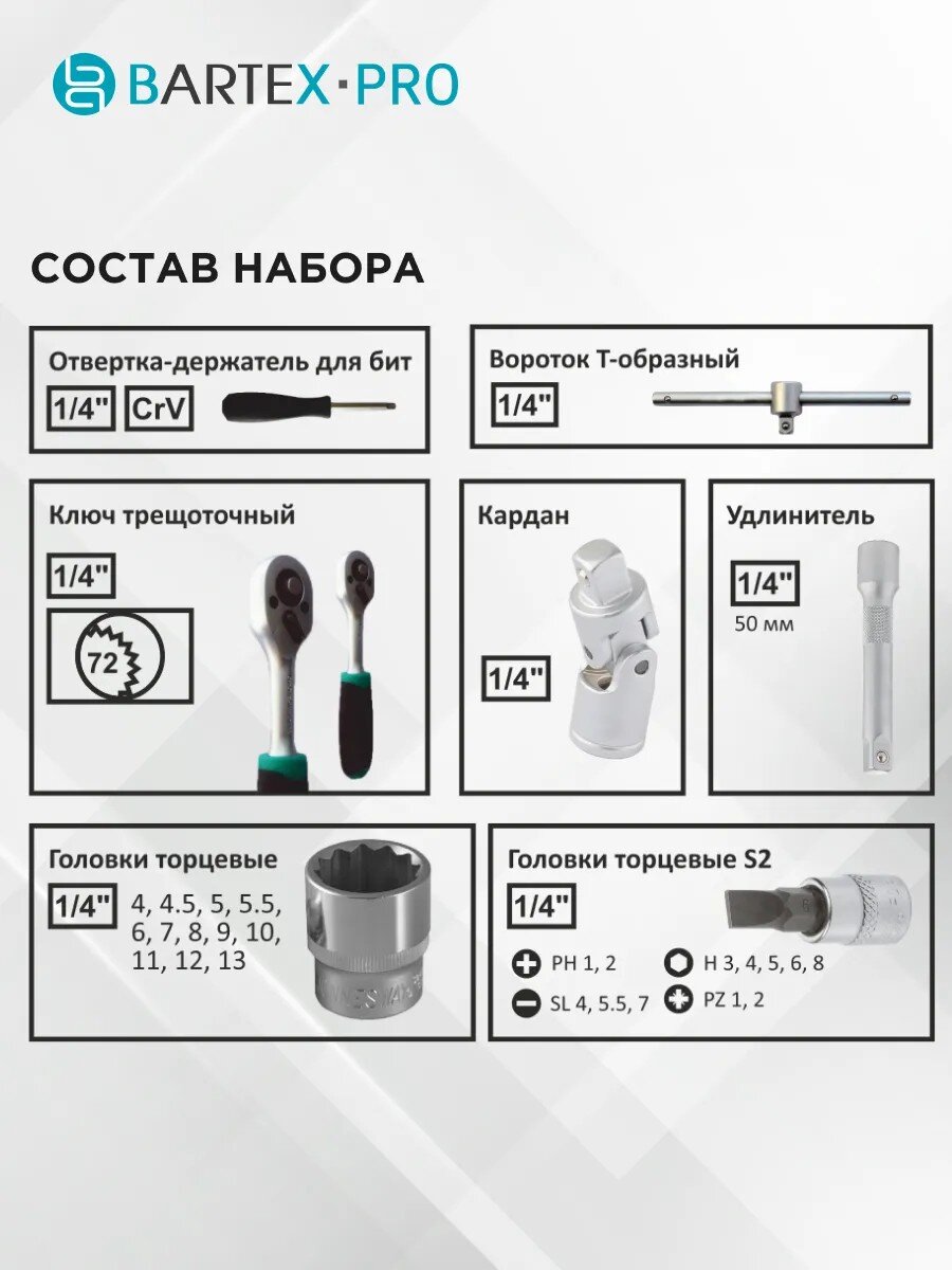 Вы можете приобрести «Набор слесарных инструментов Bartex, Pro, 1/4", 6-гранный, сталь, кейс, 29 предметов» и другие товары в нашем интернет-магазине в Ельце по низким ценам и с бесплатным самовывозом.