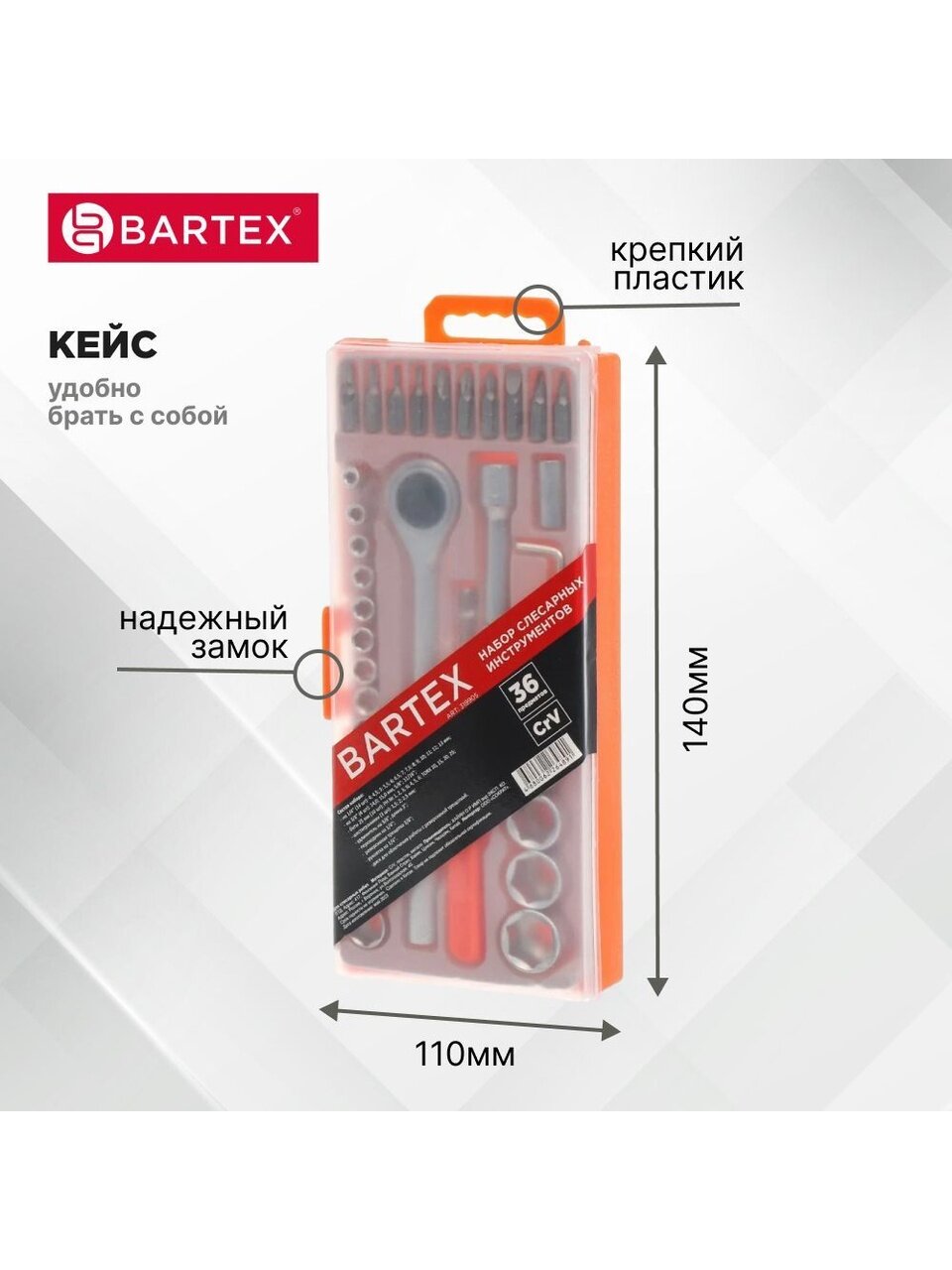 Функциональный набор инструментов Bartex придёт Вам на помощь при проведении ремонтных работ, в том числе и в автомобиле. Компактный размер кейса позволит Вам с легкостью разместить его в багажнике и всегда быть готовым к неожиданностям на дороге. Набор выглядит очень стильно, поэтому его, без сомнений, можно приобрести в качестве подарка для близкого человека. Любому мастеру придётся по душе такой нужный подарок в качественном исполнении.