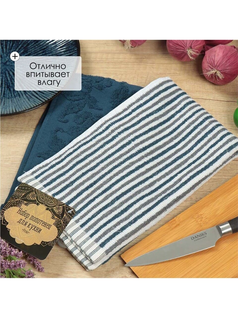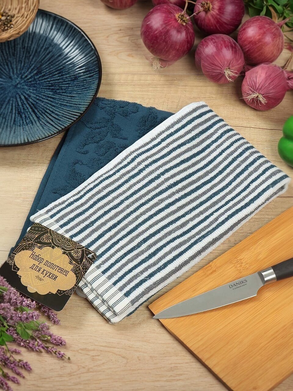 Кухонное полотенце - непременный атрибут каждой кухни. Его используют для вытирания рук, посуды и рабочей поверхности стола. Данные полотенца, гармонично дополнят дизайн Вашей кухни и поднимут настроение. Полотенца для кухни прочны, приятны на ощупь, способны хорошо впитывать влагу и оставаться привлекательными даже после многочисленных стирок. В наборе 2 полотенца размером 30х50 см.
