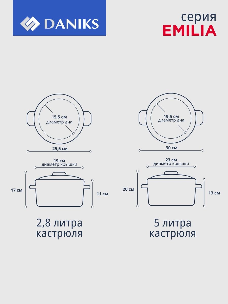 Ищете, какой набор посуды выбрать для индукционной плиты или универсального использования? Daniks Эмилия — это комплект из 6 предметов: две кастрюли (2,8 и 5 л), ковш (2 л) и стеклянные крышки. Корпус из нержавеющей стали устойчив к коррозии, не впитывает запахи, легко моется и сохраняет внешний вид даже при интенсивном использовании. Такой набор посуды отлично подойдет для приготовления супов, гарниров, соусов, а также для стерилизации и заготовок на даче.