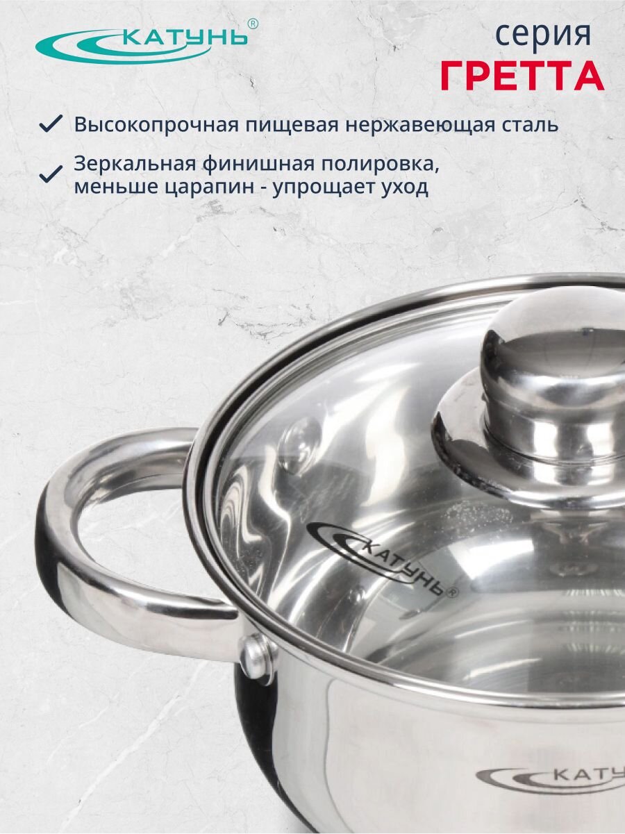 Набор посуды из нержавеющей стали Катунь Гретта 6 предметов — универсальное решение для дома, дачи и подарка: подходит для индукционных плит, долговечен, легко мыть.