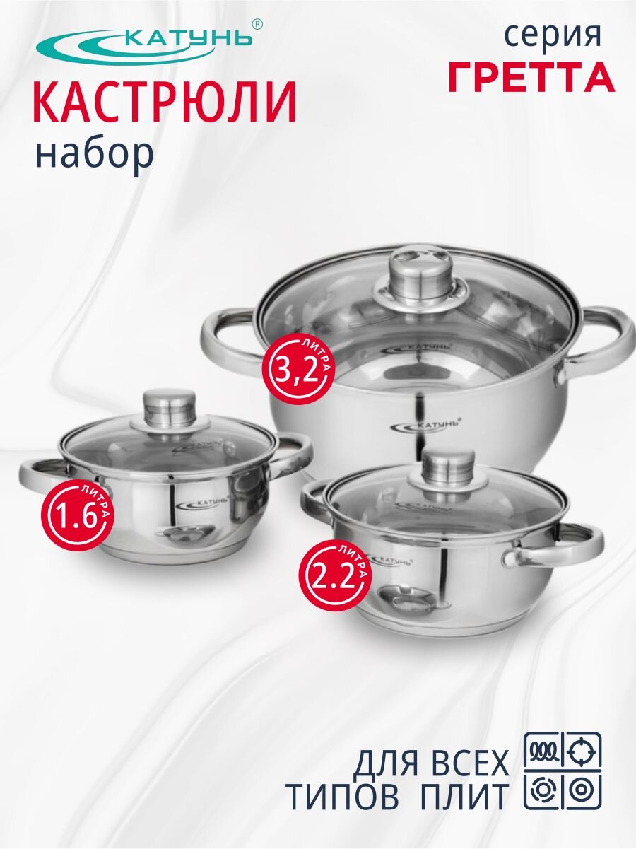 Вы можете приобрести «Набор посуды нержавеющая сталь, 6 предметов, кастрюли 1.6,2.2,3.2 л, индукция, Катунь, Гретта, KT04-A» и другие товары в нашем интернет-магазине в Твери по низким ценам и с бесплатным самовывозом.
