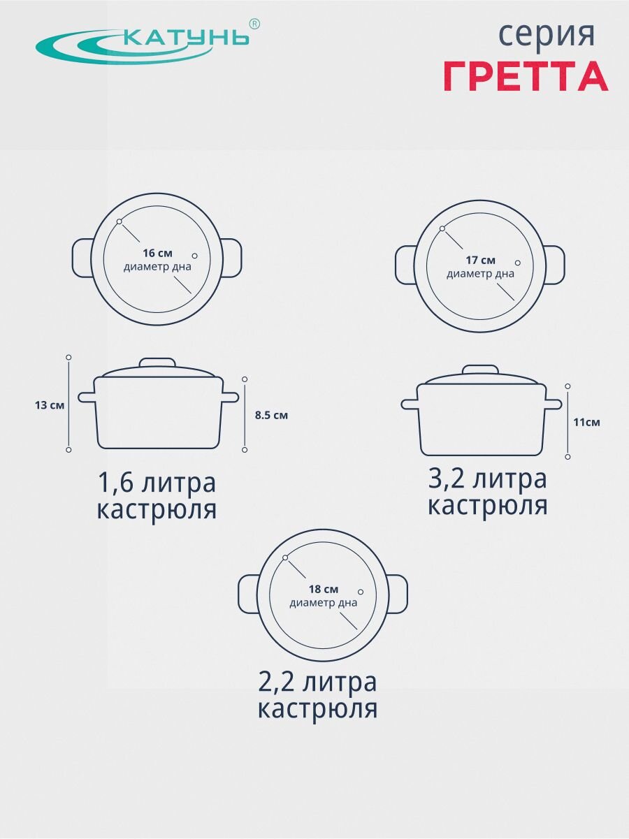 В комплекте три кастрюли: 1.6, 2.2 и 3.2 литра. Меньшая подходит для соусов и гарниров, средняя — для супов, большая — для тушения и варки на семью.