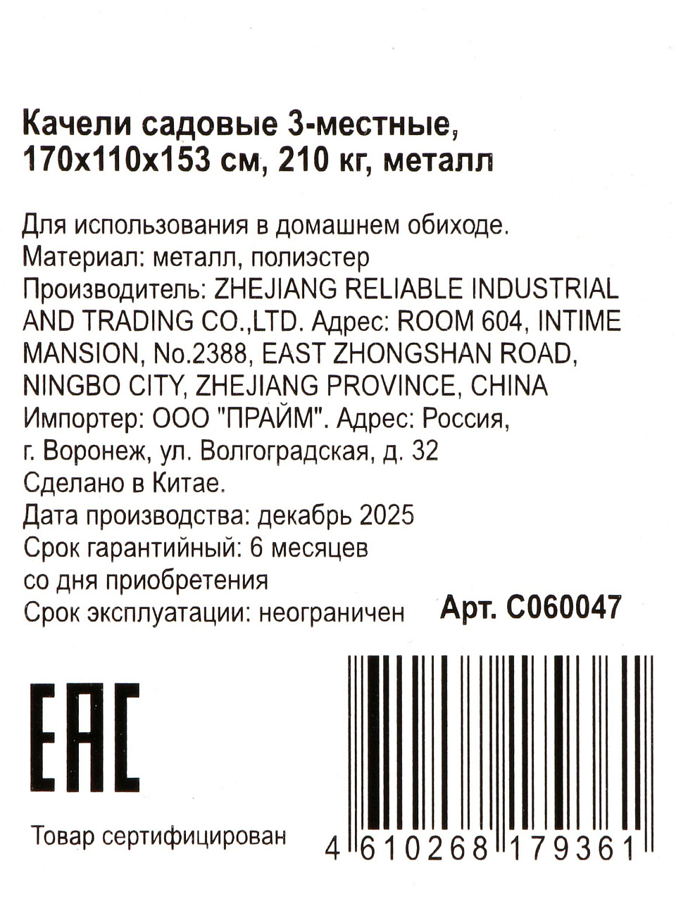 Вы можете приобрести «Качели садовые 3-местные, 170х110х153 см, 210 кг, Крокус, металл, C060047» и другие товары в нашем интернет-магазине в Воронеже по низким ценам и с бесплатным самовывозом.