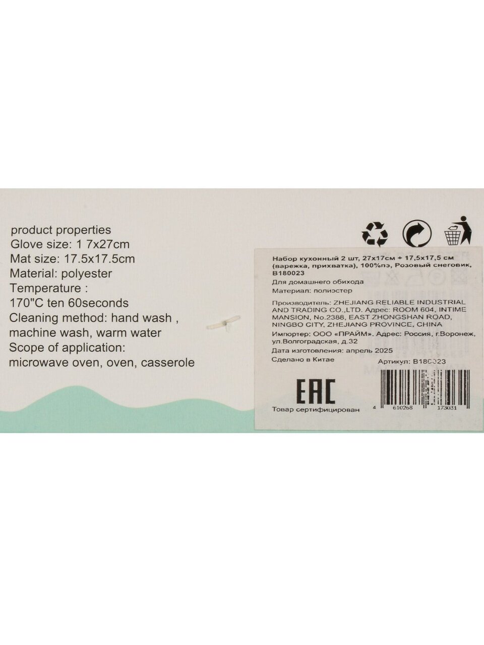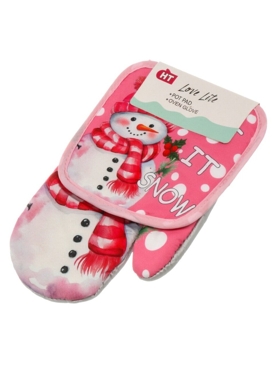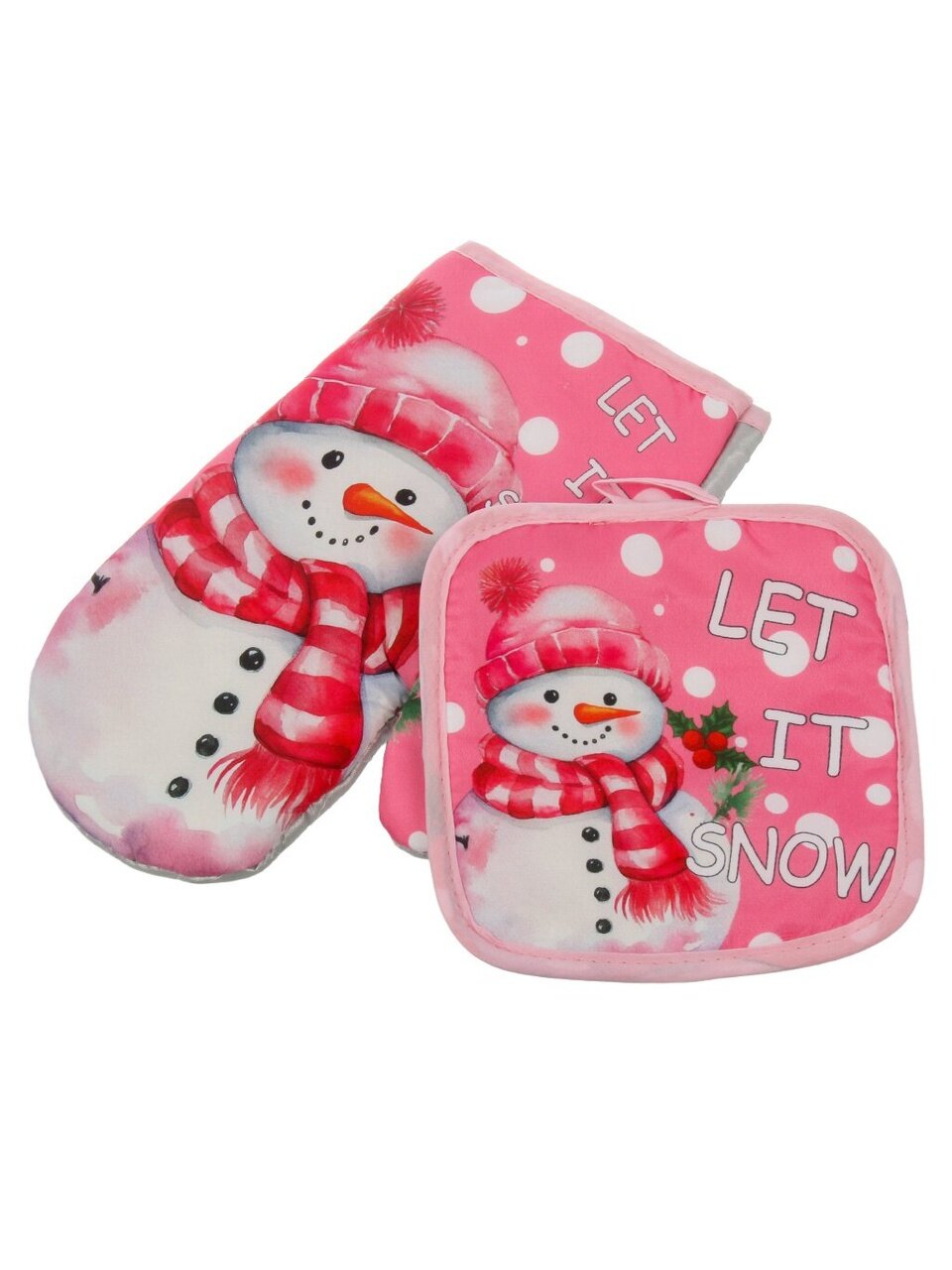 Набор кухонный «Розовый снеговик»: 2 предмета (варежка и прихватка) из 100% полиэстера, идеальный подарок для уютной кухни и безопасной готовки к Новому году.