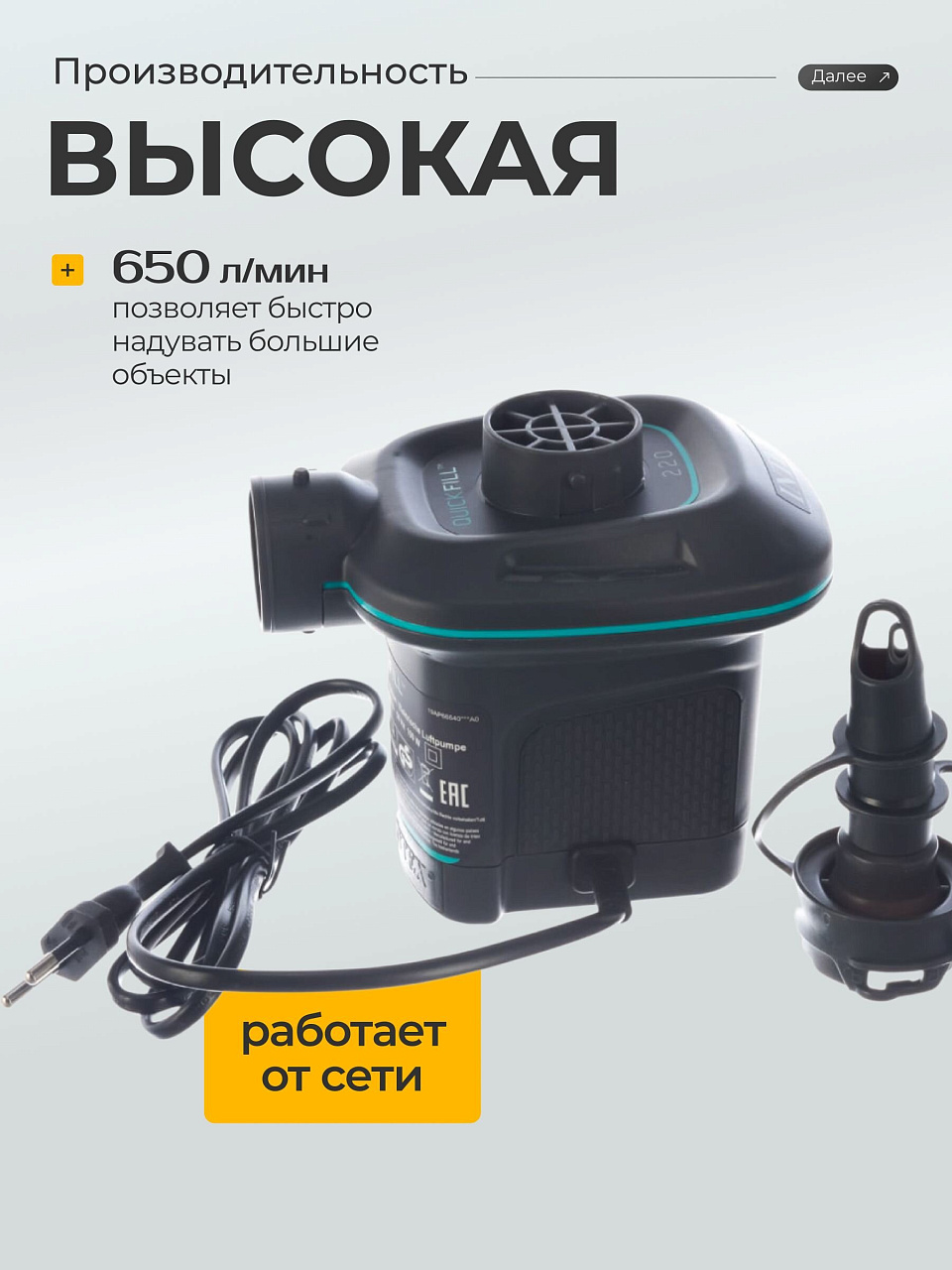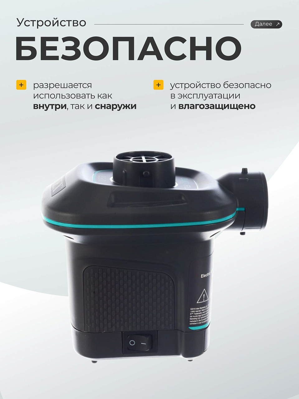 - Работает от сети переменного тока 220-240 В, что позволяет использовать его в любом месте, где есть доступ к розетке. Благодаря этому вы можете легко и быстро надуть различные предметы, где бы вы ни находились.