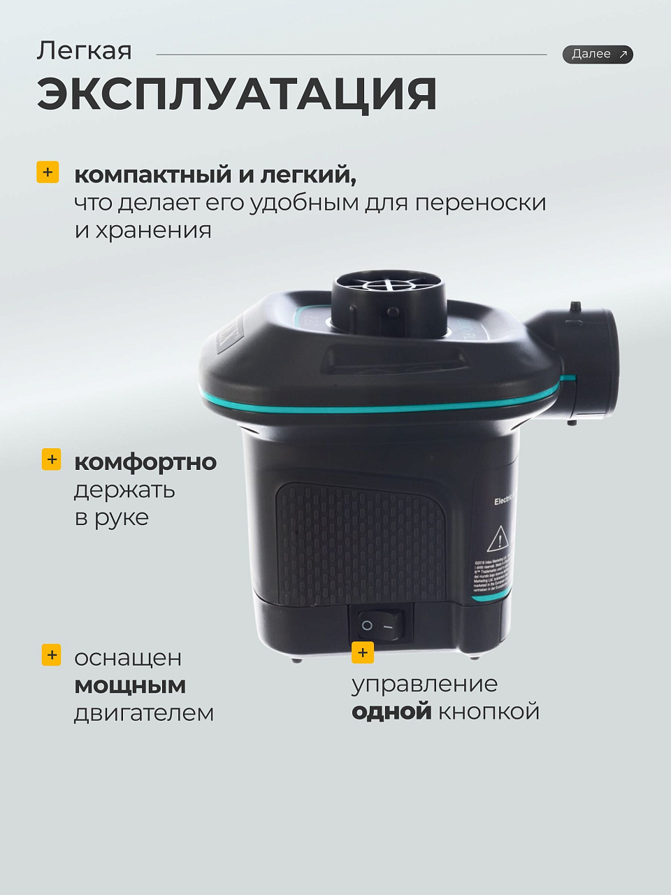 - Оснащен мощным двигателем, который обеспечивает быстрое и эффективное накачивание, сокращая время и усилия, которые вы тратите на этот процесс.