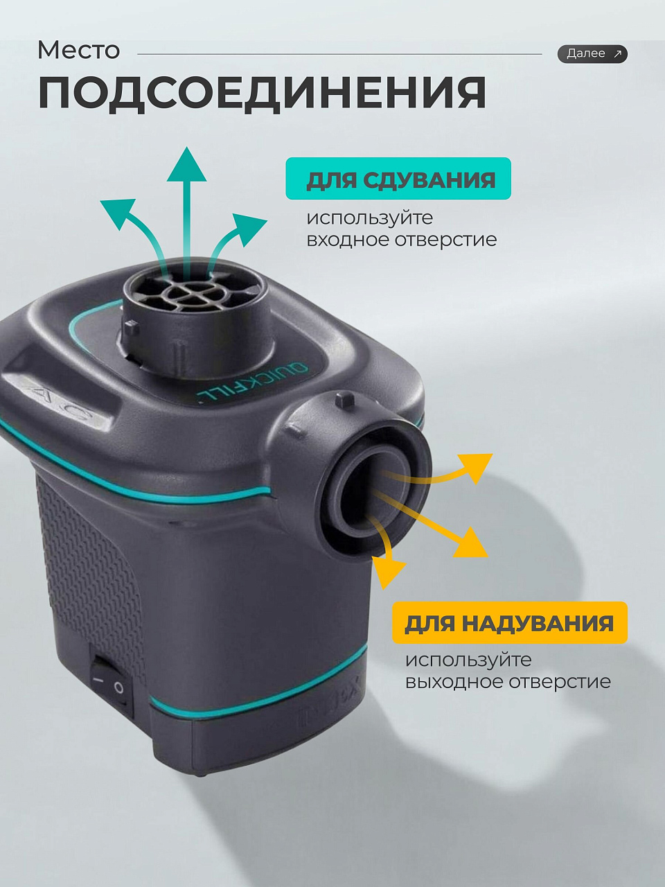 - Высокая производительность. Насос способен накачивать до 650 литров воздуха в минуту, что позволяет быстро надувать большие объекты. Это особенно полезно, если у вас есть большой надувной матрас или кровать, которую нужно надуть перед сном.