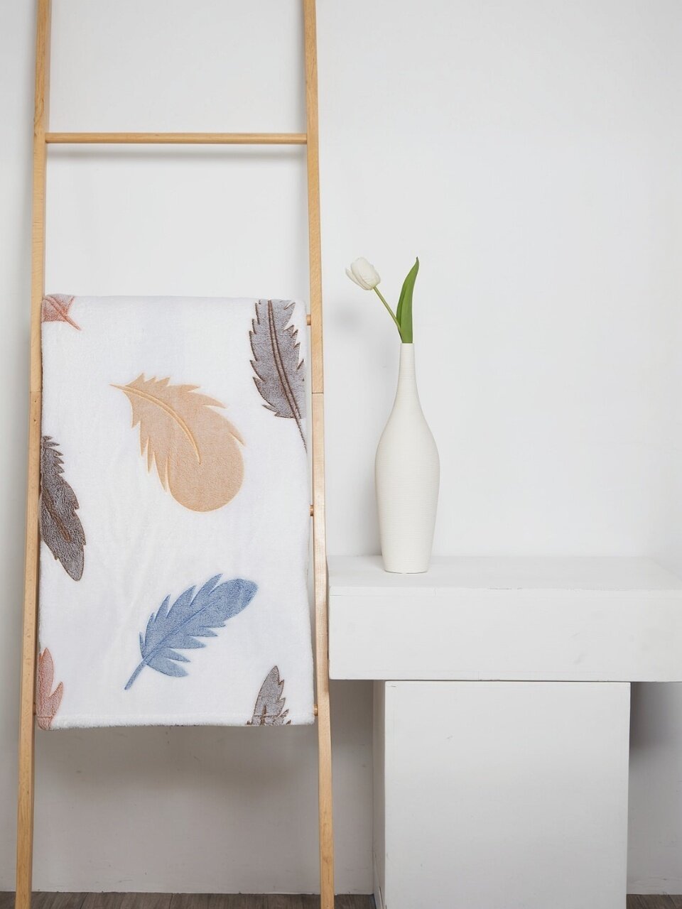 Как выбрать размер пледа? Для двуспальной кровати или большого дивана оптимально подойдёт формат 180х200 см — такой плед полностью укроет двоих взрослых или станет уютным покрывалом. Благодаря стильному рисунку «Перо» и универсальному белому цвету, плед гармонирует с любым интерьером и станет отличным подарком. Подходит ли для аллергиков? Да, синтетический велсофт не вызывает раздражения, не накапливает пыль и легко очищается.